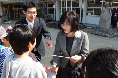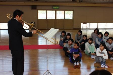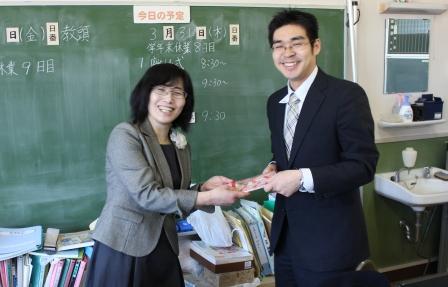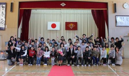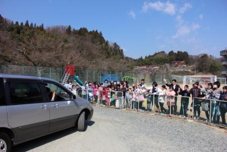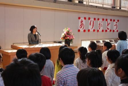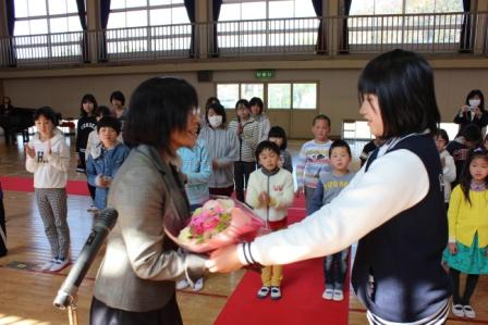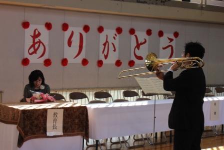 職員のみでのお別れ会では、3・4年担任から感謝のメッセージをお渡ししました。体育館での「離任式」では、校長より転出職員の紹介、転出職員のあいさつ、児童代表のお別れの言葉(5年Sさん)と花束贈呈(4年Hさん)があり、最後に、柏木先生からトロンボーンでの演奏(少年時代)のプレゼントがありました。また、卒業生8名も参加してくれたので、卒業生へも演奏(翼をください)のプレゼントがありました。卒業生も中学校で頑張ってくれることでしょう。最後のお別れ、見送りでは、5年生のSさんの校旗を先頭に、子ども達は山代先生と言葉を交わしながら、感謝の気持ちを伝え、お別れしました。3・4年生からは色紙のプレゼントもありました。4月からの山代先生の新しい門出を心から祝福し、最後まで手を振る児童の姿がありました。