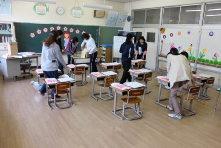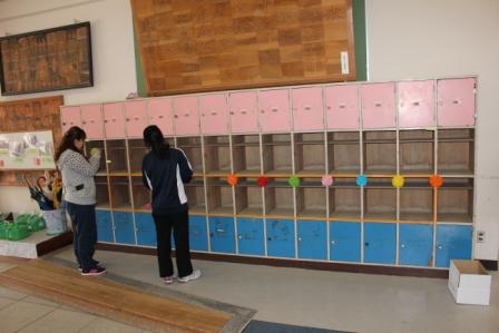 【写真 左・中:4/4 1年生教室・下駄箱等の準備を全職員で行いました。 右:入学お祝い品】
