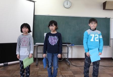 22日に行われた「冬休み前集会」では、児童発表を行いました。テーマは「今年を振り返って」です。1・3・5年の代表児童が発表しました。