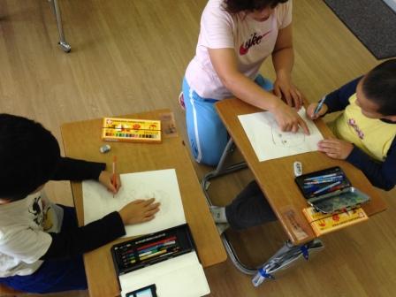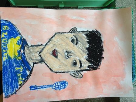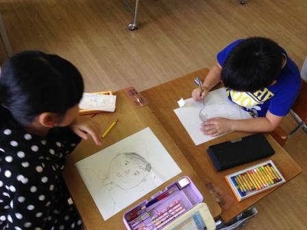 9月10日(木)、1年生をのぞいてみると、お友達と向かい合って何かを描いています。お友達の顔です。お友達の顔を見て、顔の輪郭や髪の毛、目、鼻などをていねいに表現します。よく観察しないと描けないですね。最初は、顔の輪郭も難しそうでしたが、担任の先生に何度も何度も教えてもらいながら、しっかり描くことができました。上手にできたね。写真右の顔は誰でしょう?わかるかな?