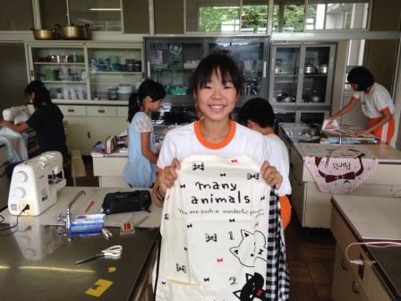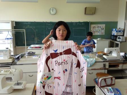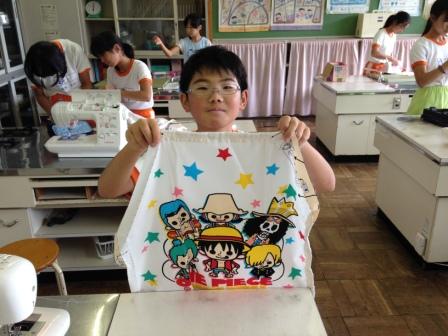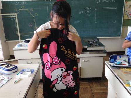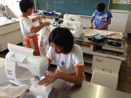 9月11日(金)、大雨の被害がないか校舎内を巡視していると、家庭科室で作業している6年生の姿がありました。巡視を中断し中をのぞくと、子どもたちは一生懸命に縫い物をしています。ミシンを使う児童もいました。作成していたのは「エプロン」。好きなキャラクターなどが描かれた物もあるようです。完成が楽しみですね。