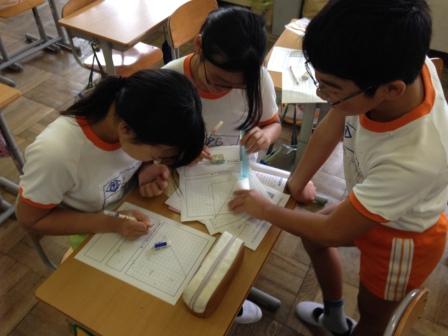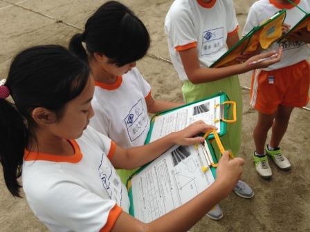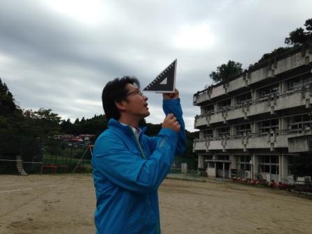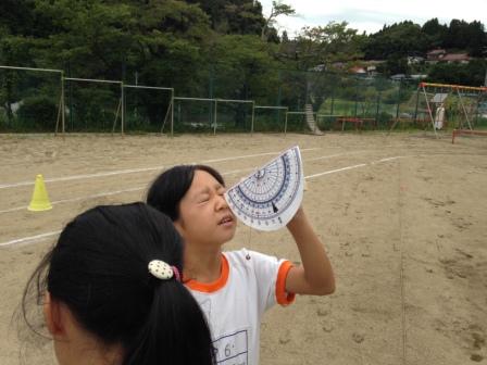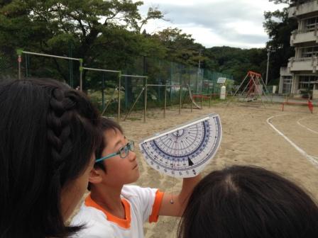 9月15日(月)2校時、6年生の算数の授業です。直接測ることができない校舎の実際の高さを、縮図を利用して求める授業です。縮図を書くために、校舎までの距離や見上げた角度を測定します。「高さ分度器」の道具を使いながら、1班3人で協力しながら測定しました。6m、8m、10m、15m、20m、24mの距離から3地点を選び、そこから校舎の上はしを見上げます。8mの距離から見上げた角度は55度、15mの距離からは38度、24mの距離からは25度と測定できました。また、測定した人の目までの高さも測ります。この測定値を利用しながら、100分の1、200分の1から縮尺を選び、直角三角形を書きます。その縮図を利用し、校舎の高さは約13mと求めることができました。子どもたちは、算数で学んだことが実際の生活の場面で活用できることを学びました。縮図を書かないでも求められる方法として見上げた角度が45度の地点に立ち、そこから校舎までの距離と目までの高さから、簡単に求める方法を校長が紹介しました。直角二等辺三角形の図形の性質を利用する方法です。この高さを測る方法は江戸時代から使われていました。昔の人の知恵ですね。算数ってすごいね。