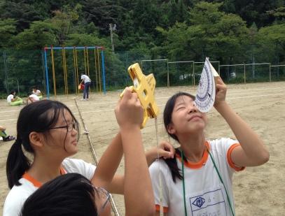 【写真 左:15m地点から見上げています(38度) 中:24m地点、校舎から離れると見上げる角度は小さくなるね 右:8m地点、目までの高さも測ります】