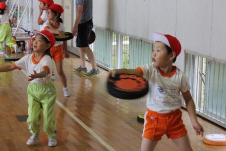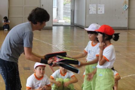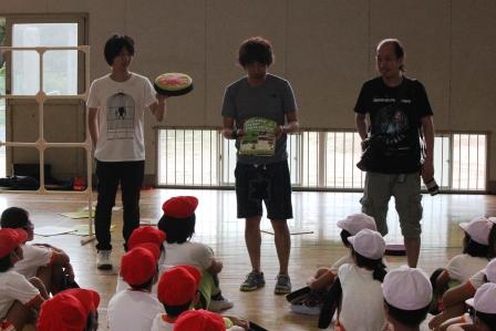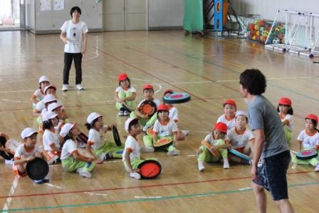 9月14日(月)、昨年に引き続き「ドッヂビー教室」が行われました。「HAPPY DISC PROJECT」の活動は、平成23年8月、原発事故での放射線量の影響から、福島県の子どもたちは屋外での活動の制限がされていることを知り、屋内で身体を動かして、ストレス発散をしながら遊べる「ドッヂビーのディスク」を届けたい!という気持ちから始まったものです。今年も代表の長峰さん(静岡県)や新妻さん(茨城県)に来ていただきました。お二人とも美容師のお仕事をしながら、仕事が休みである月・火曜日を利用して活動されています。今年は長峰さんの息子さんも来てくださいました。