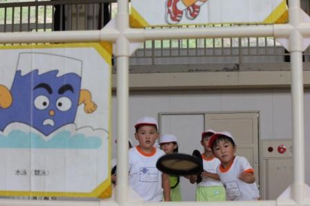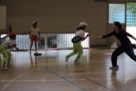 前半は1~3年生、後半は4~6年生です。1年生も上手にディスクを投げることができて、いろいろな遊び方も教えていただき、笑顔がいっぱいのドッヂビー教室になりました。紅白対抗のストラックアウトは下学年も上学年の児童も大変盛り上がっていました。