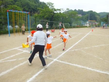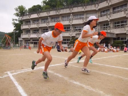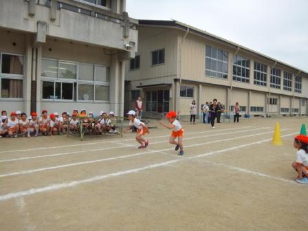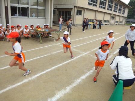 【2年生最後のランナー 白リードで3年生はつなぎます。途中で赤が抜いてアンカーに渡るときは赤がリード 白の3年生男子児童が必死に追い上げます。途中で赤を抜きました。そのままゴール。いい勝負でした。全員に大きな拍手!!】