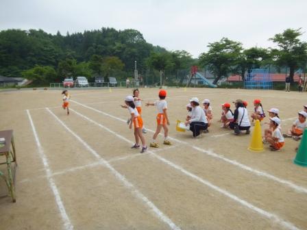 【赤がリードでバトンを受けましたが、白の女子児童が頑張り途中で抜いて、白リードでバトンパス】