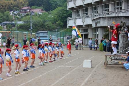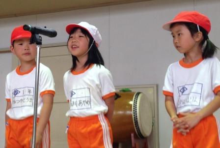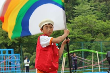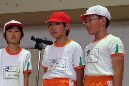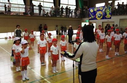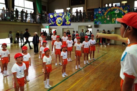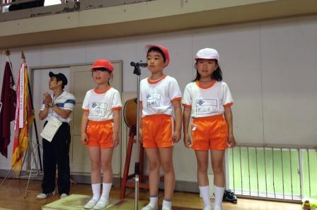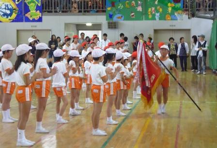 鼓笛パレードが終了し、閉会式は体育館に移動です。赤組が勝ったのか、白組が勝ったのか、子どもたちはどきどきしながら体育館に移動しました。2年生の開会の言葉から閉会式がスタートです。成績発表は5年生のSさん、「54対39で白組の勝ち!」。白組団長のRさんに優勝旗が、赤組団長のKさんに準優勝楯が授与されました。学年代表児童6名の感想発表、吉田教頭からの講評、5年生のMさん指揮による校歌、そして最後は6年生のYさんの閉会の言葉で、運動会の全日程が終了しました。体育館での開催になりましたが、子どもたちの一生懸命の姿をお見せすることができたと思います。多くの方々のご声援ありがとうございました。
