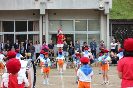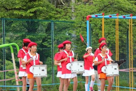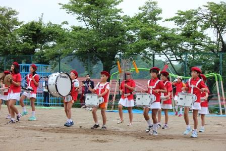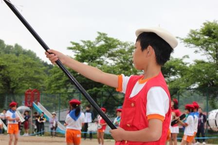 最後の演技は「鼓笛パレード」。予定時刻は11時30分。この頃には雨がやみ、校庭の水たまりも少なくなりました。前日まで一生懸命に練習してきた「鼓笛パレード」、校庭でやりたいという全員の思いが神様に通じたのでしょう。役員さんに砂を入れていただき、校庭も子どもたちが歩けるようになりました。来賓の皆様や保護者の皆様には、校庭から子どもたちの演技を見ていただきました。