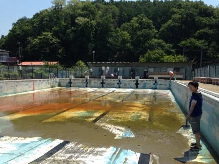 2015年5月25日 12時19分 5月25日(月)3・4校時、先生方と5・6年生でプール清掃を行いました。昨年度までは先生方だけで行っていましたが、今年度から5・6年生も行うようにしました。水を抜いたプールはヘドロでいっぱい。プール底面は先生方で行い、子どもたちは更衣室・トイレ・シャワー等とプールの側面の清掃を行いました。プールに水を入れるまではもう少しきれいにしなくてはいけません。先生方でがんばります。