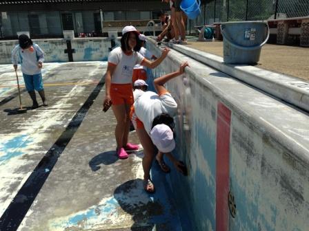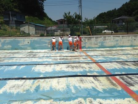 5月25日(月)3・4校時、先生方と5・6年生でプール清掃を行いました。昨年度までは先生方だけで行っていましたが、今年度から5・6年生も行うようにしました。水を抜いたプールはヘドロでいっぱい。プール底面は先生方で行い、子どもたちは更衣室・トイレ・シャワー等とプールの側面の清掃を行いました。プールに水を入れるまではもう少しきれいにしなくてはいけません。先生方でがんばります。