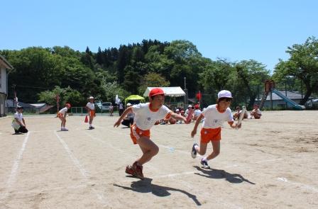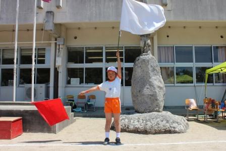 運動会の花、最後の演技はリレーです。今年度は、下学年(1~3年)と上学年(4~6年)に分かれての勝負です。下学年はリングバトンをリレーゾーンを使わずにパスします。昨日の予行では接戦でした。本番は赤が勝つのか白が勝つのか?子どもたちの一生懸命の走りを楽しみにして下さい。