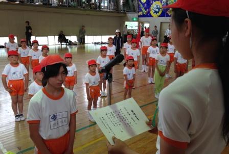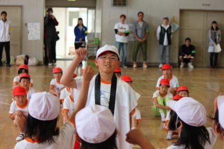 【写真 左:閉会式での感想発表(1~3年) 中・右 演技しながら係の仕事にも一生懸命な子どもたち】