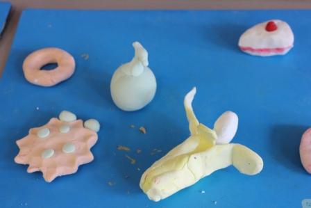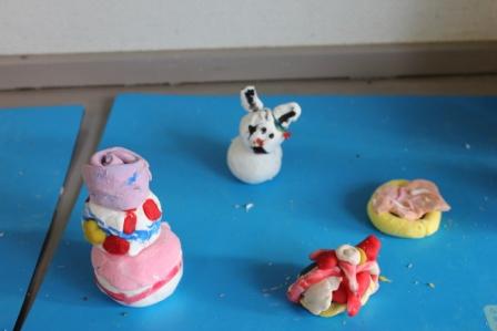 【3人の児童の作品を紹介します。どれもおいしそうですね。きれいに色を染めることもできました。クッキーだけでなく、いちごのショートケーキやドーナツ、くだもの、キャンディーなども作りました。】