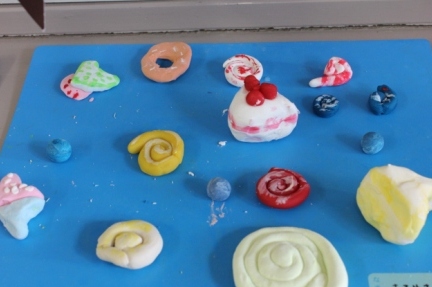 11月5日(水)3・4校時、教育実習生の先生による授業、第1学年図工「クッキーやさんに なろう」です。クッキーやさんになった気持ちで、食べてみたくなるようなクッキーの形や色を工夫して、紙粘土でつくります。出張で授業は参観できなかったのですが、子どもたちは、思い思いにクッキー等をイメージし、楽しそうに作品づくりに取り組んでいたようです。子どもたちの作品を紹介します。