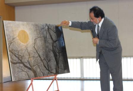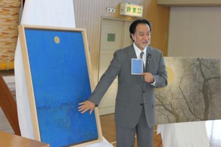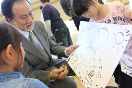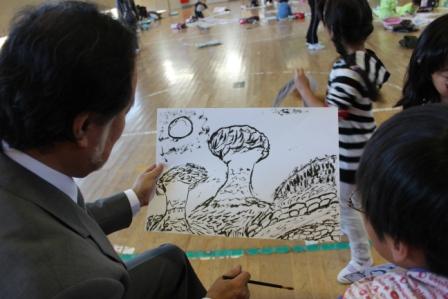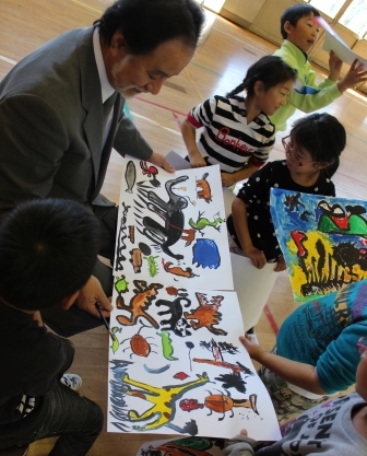 11月10日(月)2~4校時、全校児童を対象に行われた「日本画講座」。日本芸術院と文化庁協賛の「次代を担う子どもの文化芸術事業」『子ども・ゆめ・アートアカデミー』です。次代の担い手となる子ども達の発想力やコミュニケーション能力の育成を図り、将来の芸術家の育成や芸術鑑賞能力の向上につなげることを目的として、日本画家の「福王寺一彦」先生に来ていただきました。平成10年には院展で最高の内閣総理大臣賞を受賞されている、日本を代表する画家です。講座では、絵はがき(一人一人にプレゼント)や作品を通して、技法や制作について教えてくださいました。次は実際に絵を描きます。自分が感動したことや好きなこと思い出などを、下書きせずに墨を使って直接画用紙に描いていきます。子ども達は作品を福王寺先生にみていただきます。まずは、どんな絵を描いたか、福王寺先生にきとんと説明します。その後、一人一人の墨絵に「表情がいいね」「太い線と細い線のバランスいいね」「○○がすてきですね」などたくさん褒めていただきました。子ども達の目は輝いています。着色後も「色をつけるとさらによくなったね」「赤や黄の色があざやかだね」など、子ども達のよいところをたくさん褒めて伸ばしてくださいました。「関心・感動・感謝」の一日になりました。