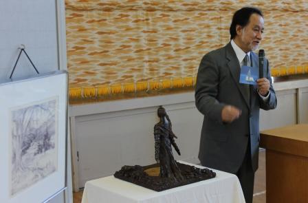 【日本画家の福王寺一彦先生 左:絵はがきになっている作品 中:ブロンズ像をつくり絵を描きます 右:水筆で描いています。完成まで10年を費やした作品もあるそうです。】