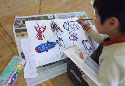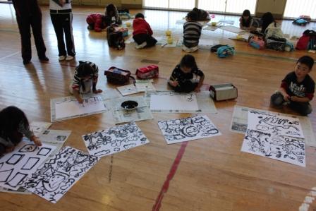 【左:6年生も自分の絵を説明しています。 中:大好きな動物の絵を描いている1年生。 右:2枚の大作です。「横につなげても縦につなげても楽しいね」 絵を描くのが大好きになりました。】