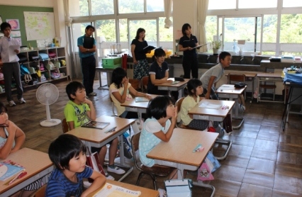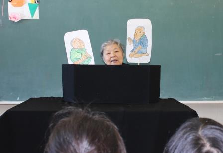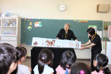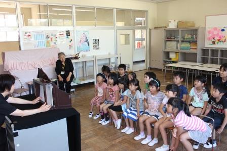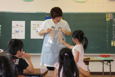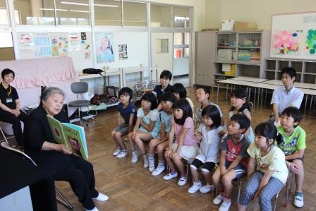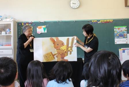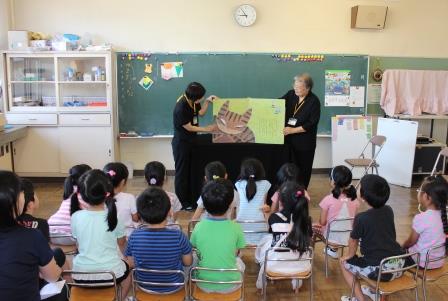 7月15日(火)1・2校時、田村市図書館の土屋さんと今泉さんに来ていただき、お話会が行われました。1校時は1年生。絵本「ふしぎなナイフ」と「しっぽ しっぽ しっぽ」、ビックブック「にゃーご」、ペープサート「ねずみのすもう」、紙芝居「だんごむしのころちゃん」、テーブルシアター「わらぶきやねのいえ」の6話です。2校時は2・3年生。絵本「あしたうちにねこがくるの」と「ぶたのたね」と「にらめっこ」、お話「においのねだん」、ビックブック「どうぞのいす」、牛乳パックシアター「おぼえたかな」の6話です。子どもたちは話に引き込まれていました。