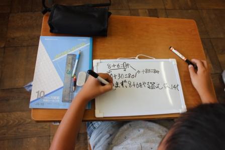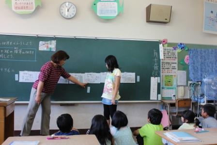 7月15日(火)3校時、第3学年算数科授業研究会を行いました。「確かな学力の定着を目指した学習活動の展開」を研究主題にし、「互いに伝え合い、共に学び合う活動を目指して」を副主題として1年間取り組んでいます。本時の授業は、「計算のしかたをくふうしよう~暗算~」の単元で、「2位数どうしの加法の暗算のしかたを理解し、暗算の手順をわかりやすく説明することができる」をねらいとしています。授業では、「48+36」を自分なりの暗算の計算方法で考え、その考えを友達にわかりやすく説明する子どもたちの姿がありました。「40+30=70、8+6=14、合わせて84」の計算方法を「さくらんぼ」の図を使いながらわかりやすく説明する児童もいました。暗算は筆算と異なって、その計算の仕方が多様で、一人ひとりの考えやすい方法を認め合えるよさがあります。この問題は「48を50と見て、50+36=86、86-2=84」と考えたりもできます。子ども自身が次第に能率的な方法を見つけられるようにしたいと考えています。次時は減法の暗算です。
