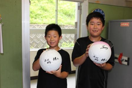 サッカー日本代表の本田圭佑選手が設立した「NOTICE of HONDA 災害支援基金」から、オリジナルサッカーボール7個が届けられました。サッカーワールドカップで盛り上がっていた時期に、東北6県の子どもたち(全2016校)へメッセージ入りのオリジナルサッカーボールを届けることにより、さらに大きな夢を抱き、協力し合って未来に進む一助となることを、本田選手等は願っているそうです。感動・感謝です。6年生児童2名に持ってもらいました。本田選手のサインが印刷されています。夏休み明けから大切に使わせていただきます。ありがとうございました。