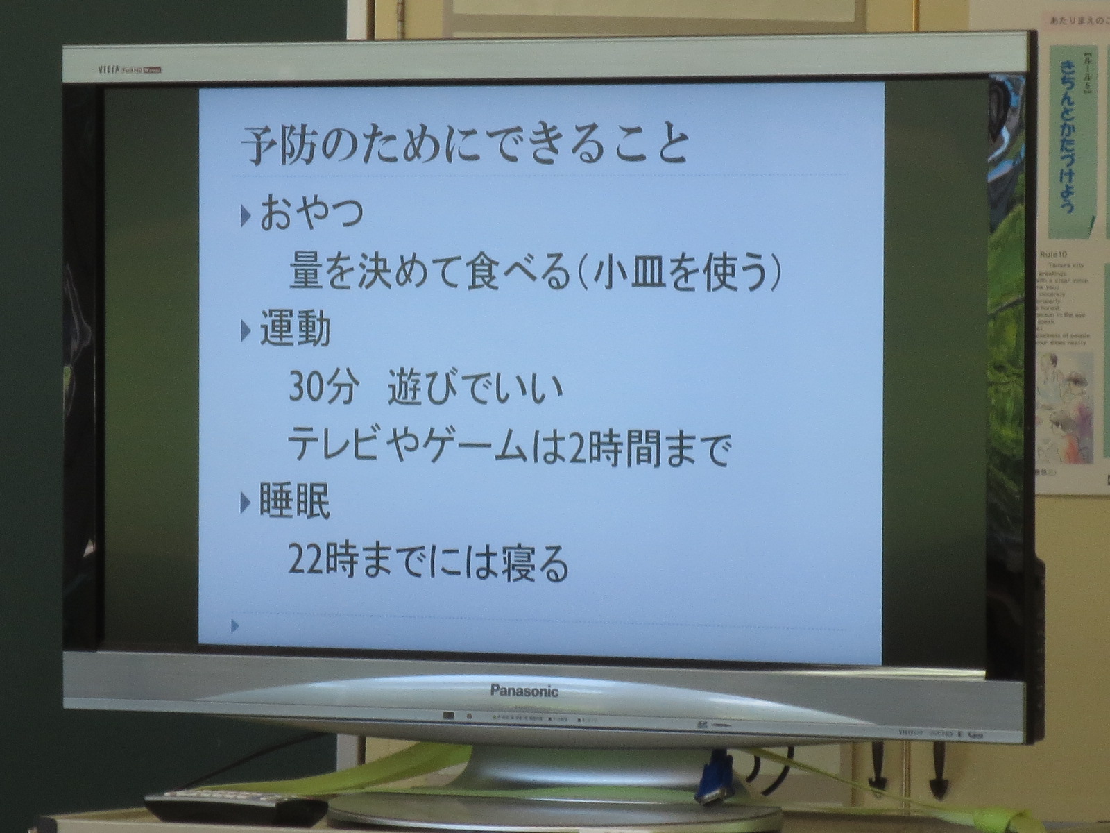 4校時目に6年生を対象にした、専門医による健康教室を行いました。福島県の子どもたちの「肥満傾向率」は、全国でもトップクラスを維持している状況です。専門医の先生から肥満と小児生活習慣病のリスクについて、パワーポイントで分かりやすく説明していただいたり、おやつの適正な分量を提示して、カロリー量を「見える化」していただくなど、おやつ・運動・睡眠の相関関係について、具体的に教えていただきました。参考にしていきたいと思います。
