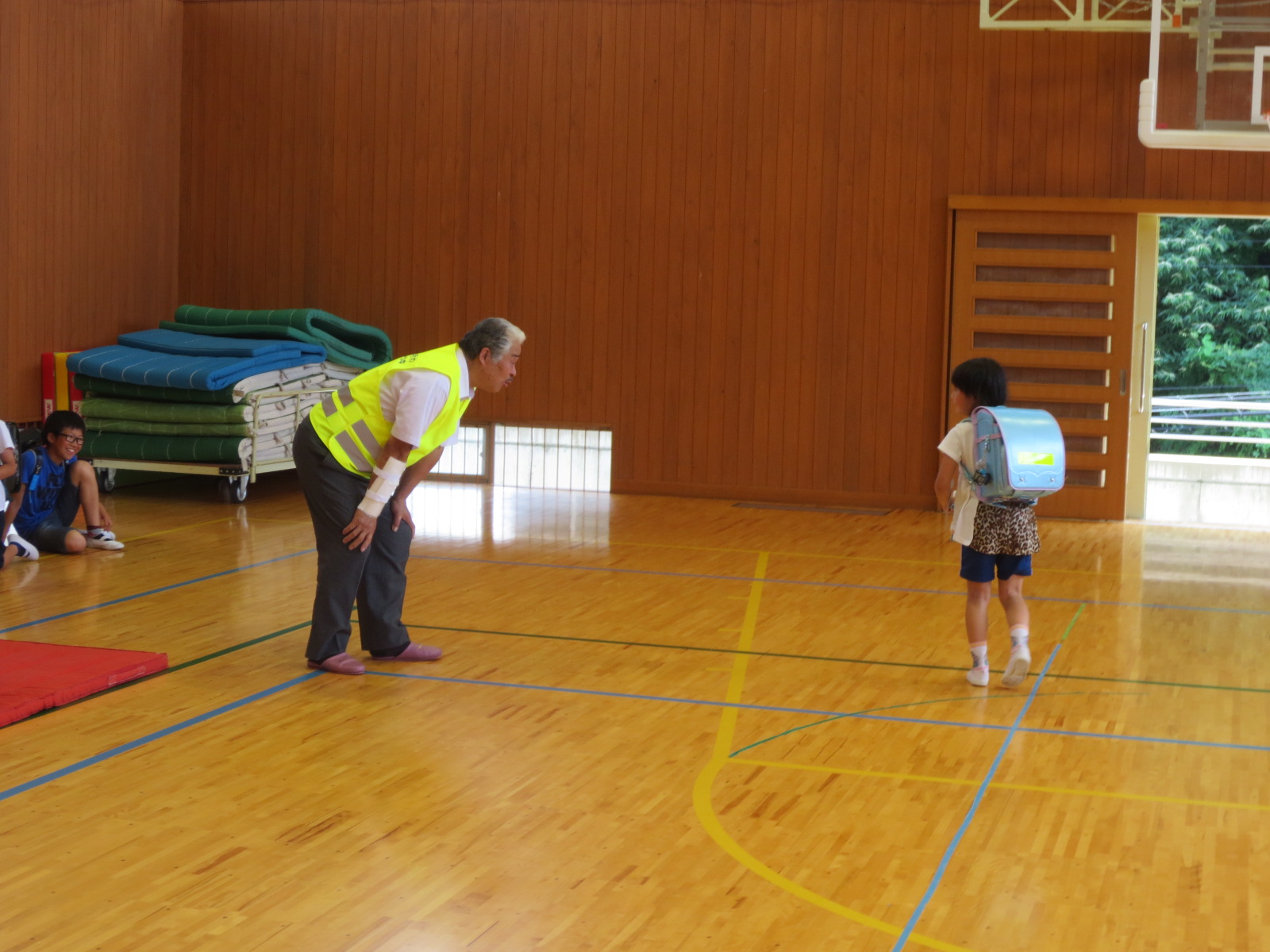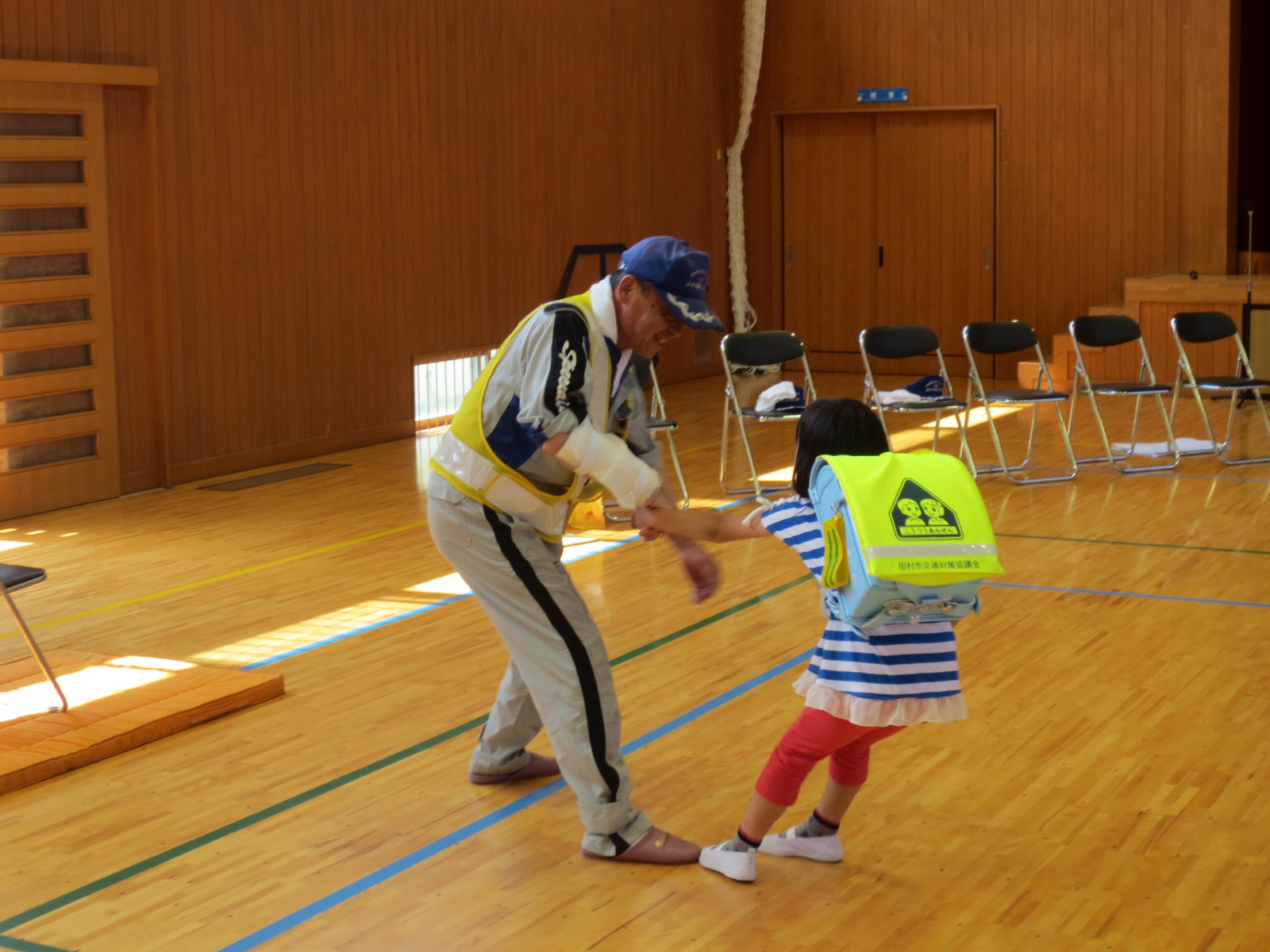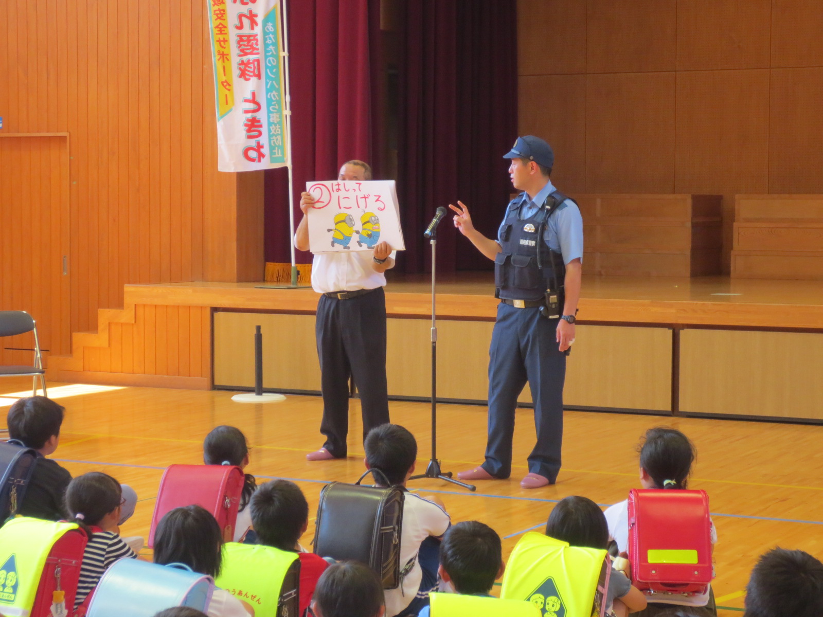 5校時目に、常葉駐在所、スクールサポーター、ふれ愛隊ときわの皆さんのご協力を得て、不審者の声かけに対応する防犯訓練を実施しました。今回の訓練では、不審人物に実際に声をかけられた際の対応(いか・の・お・す・し)をすると同時に防犯ブザーを鳴らしながら全力で逃げる訓練を行いました。さらに、腕を捕まれたときに、かみつく、さけぶ、倒れて脚をバタバタさせながら、相手の脛を蹴るなど、実践的な訓練を行いました。どんな時に、どんなことをして逃げるか、いろいろな発見があった防犯教室でした。