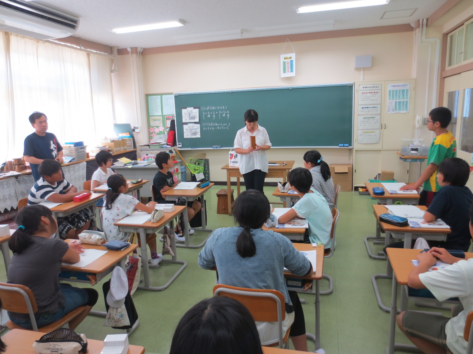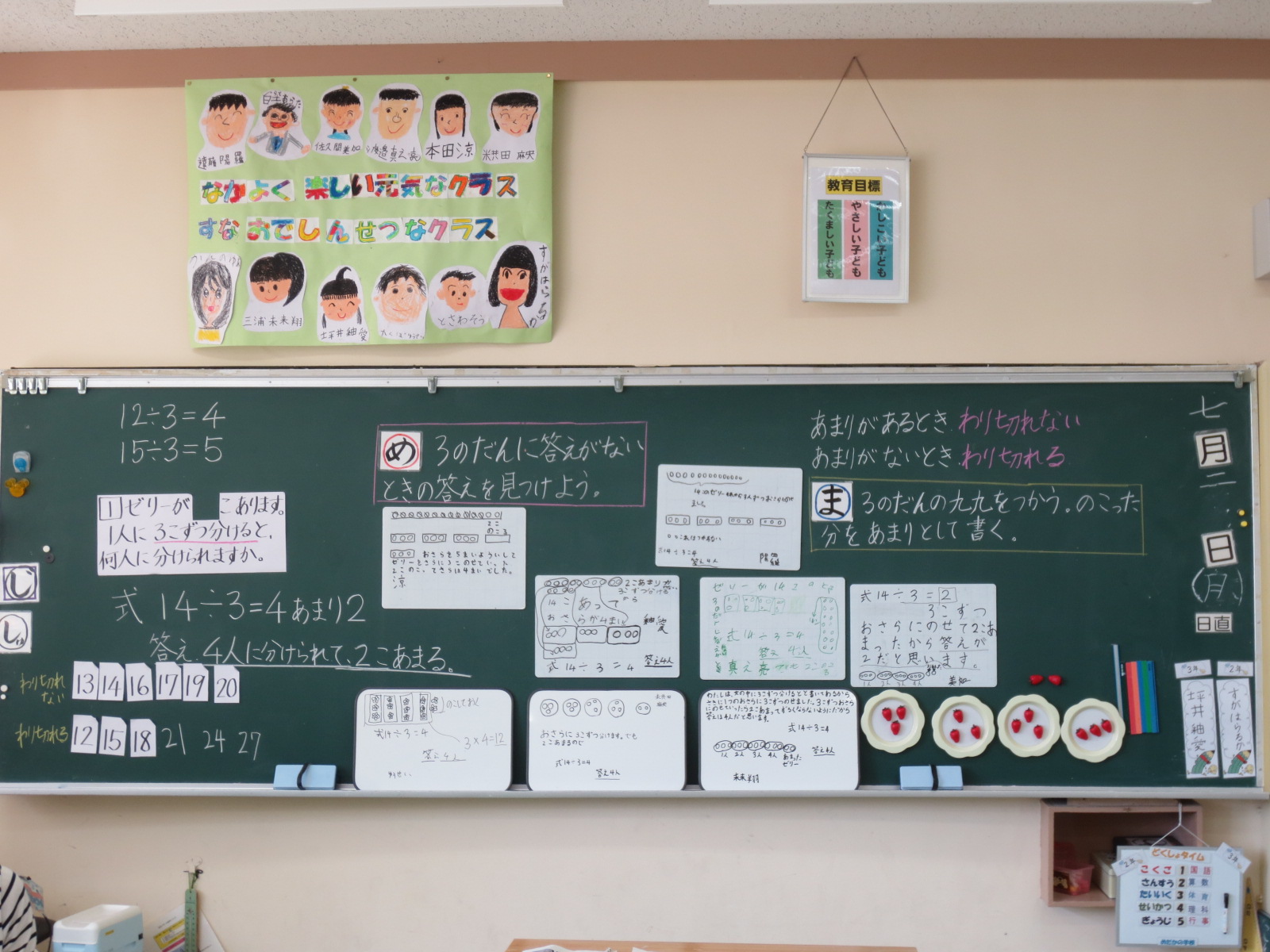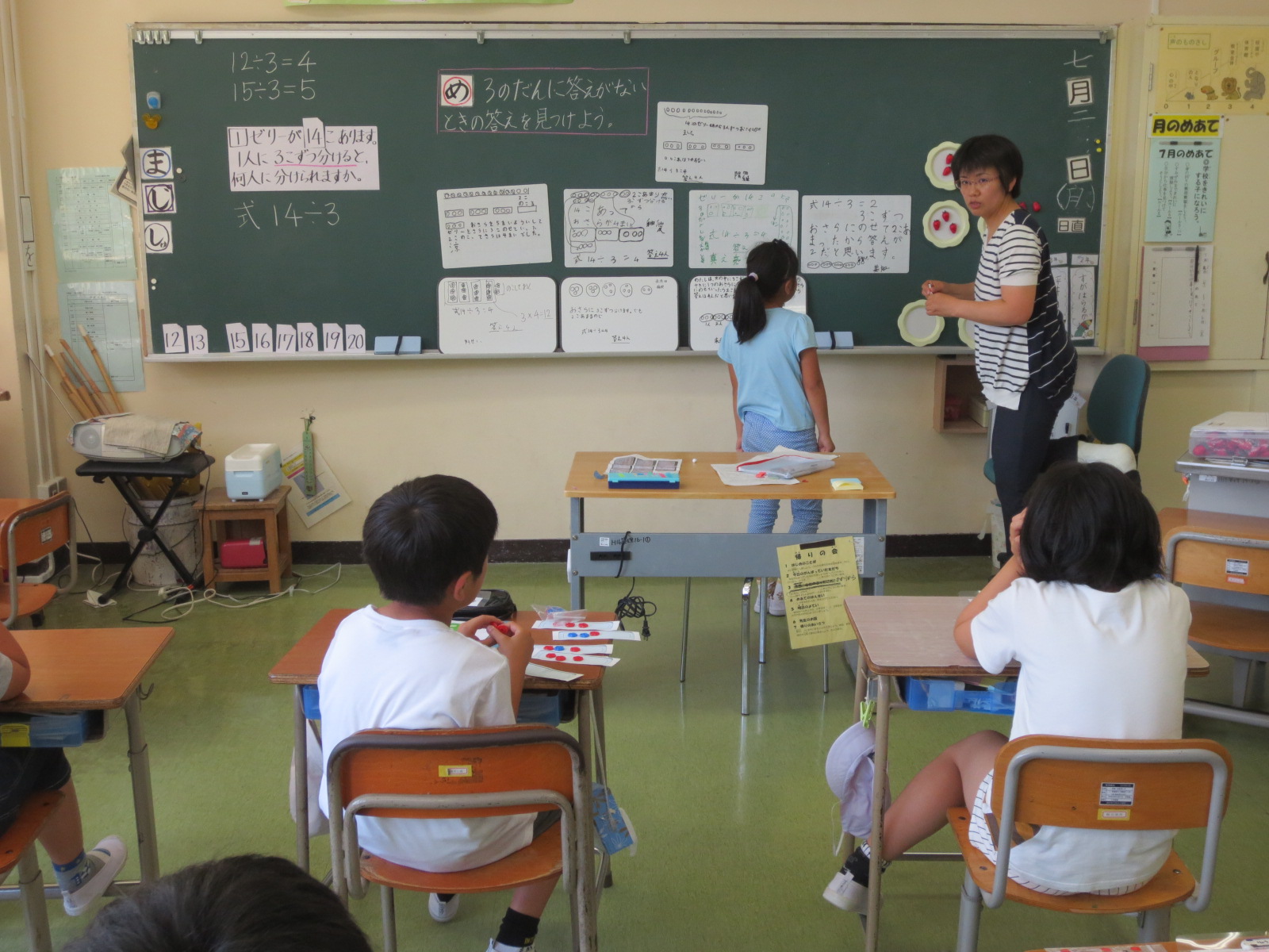 昨日、今年最初の校内授業研究会を行いました。今年度のテーマは、「自分の考えをもって、伝え合う児童の育成」とし、対話的な学習を工夫して、双方向の深い学びにつなげていくことを目指しています。今回は、3年生の「あまりのあるわり算」について、わり算の意味について習熟を図ると同時に、わり切れない場合のあまりの概念について理解を深める授業でした。子どもたちは、学習してきたことを思い出しながら、考えたことを交流し、わり切れない場合の計算の仕方を身に付けることができました。