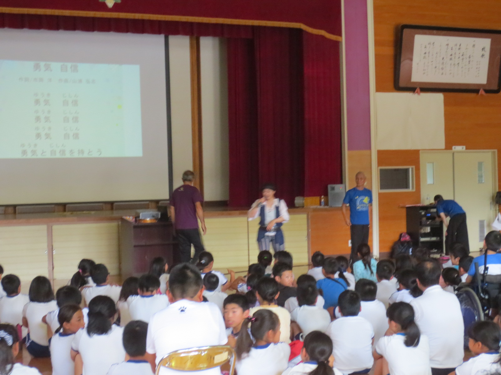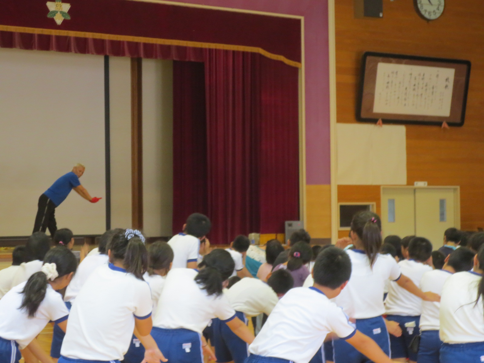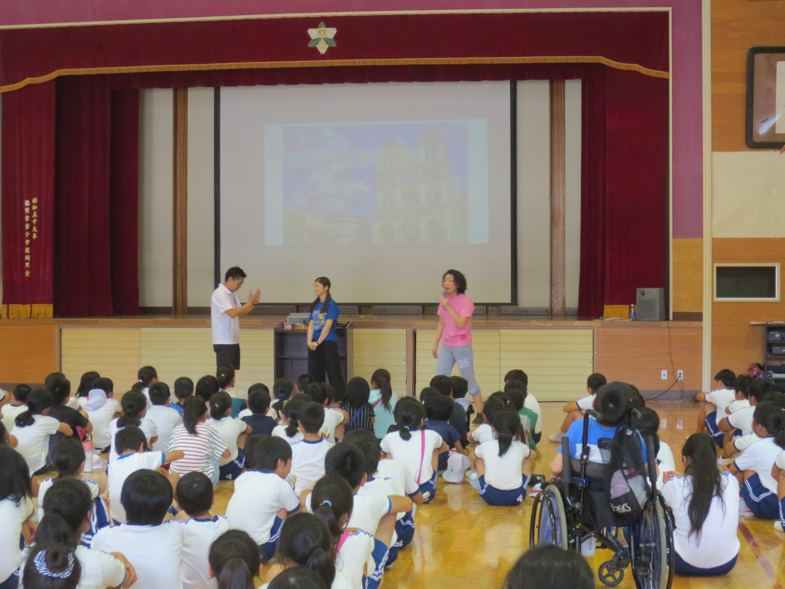 本日、文化芸術による子どもの育成事業である「ノートルダム物語」のワークショップに参加してきました。常葉・西向・関本小の4~6年生全員が常葉小学校の体育館に集合し、劇団員の方から、ノートルダム物語の粗筋や歌を聞いたり、パントマイムのパフォーマンスを指導していただいたりと、9月19日の公演に先立って行われたワークショップを楽しんでいました。