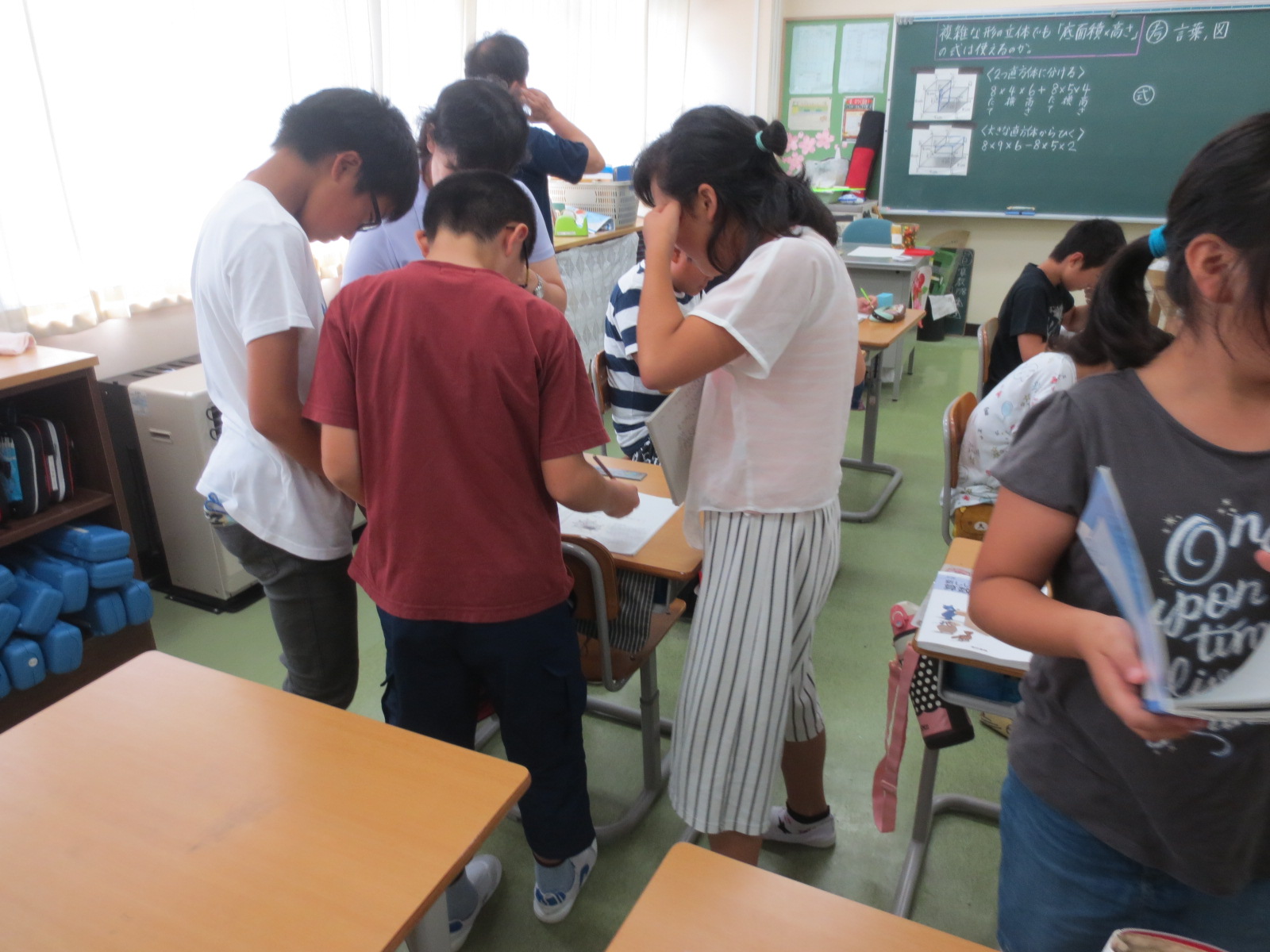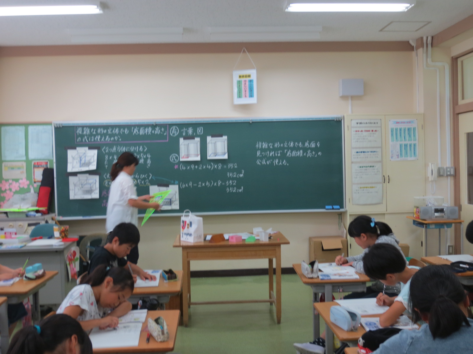 昨日の2時間目に、第6学年の授業研究を実施しました。「角柱や円柱の体積の求め方」を考える中で、直方体を組み合わせた形の体積の求め方を学習しました。子どもたちは、課題に対して解決の見通しを持ち、自分なりの考えや答えを友だちとの対話によって、さらに自分の考えを広げたり、深めたりする場面が見られました。直方体を組み合わせた形でも、かまぼこのような半円柱のような形でも、「底面積×高さ」の公式で答えが求められることに気付き、理解を確かなものにすることができました。