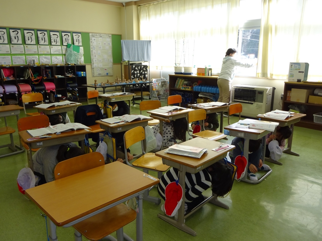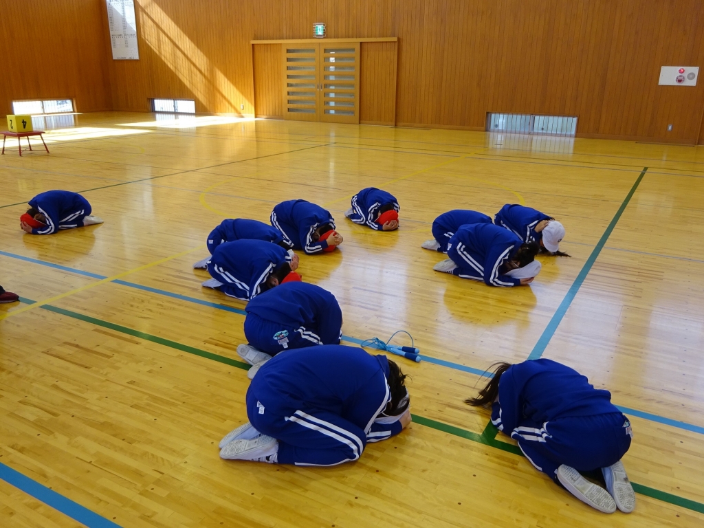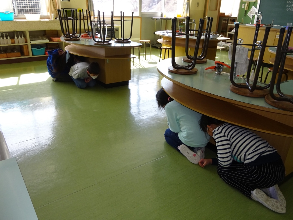 16日(金)に「シェイクアウトふくしま」県下一斉安全確保行動訓練を実施しました。訓練への参加をとおして、防災意識の高揚を図るとともに、災害などの突発事態における防災知識(まず低く・頭を守り・動かない)を確認することが目的です。子どもたちは、放送の合図とともに、すべての行動を止め、素早く突発事態が発生した際の身の安全を確保する行動をとることができました。