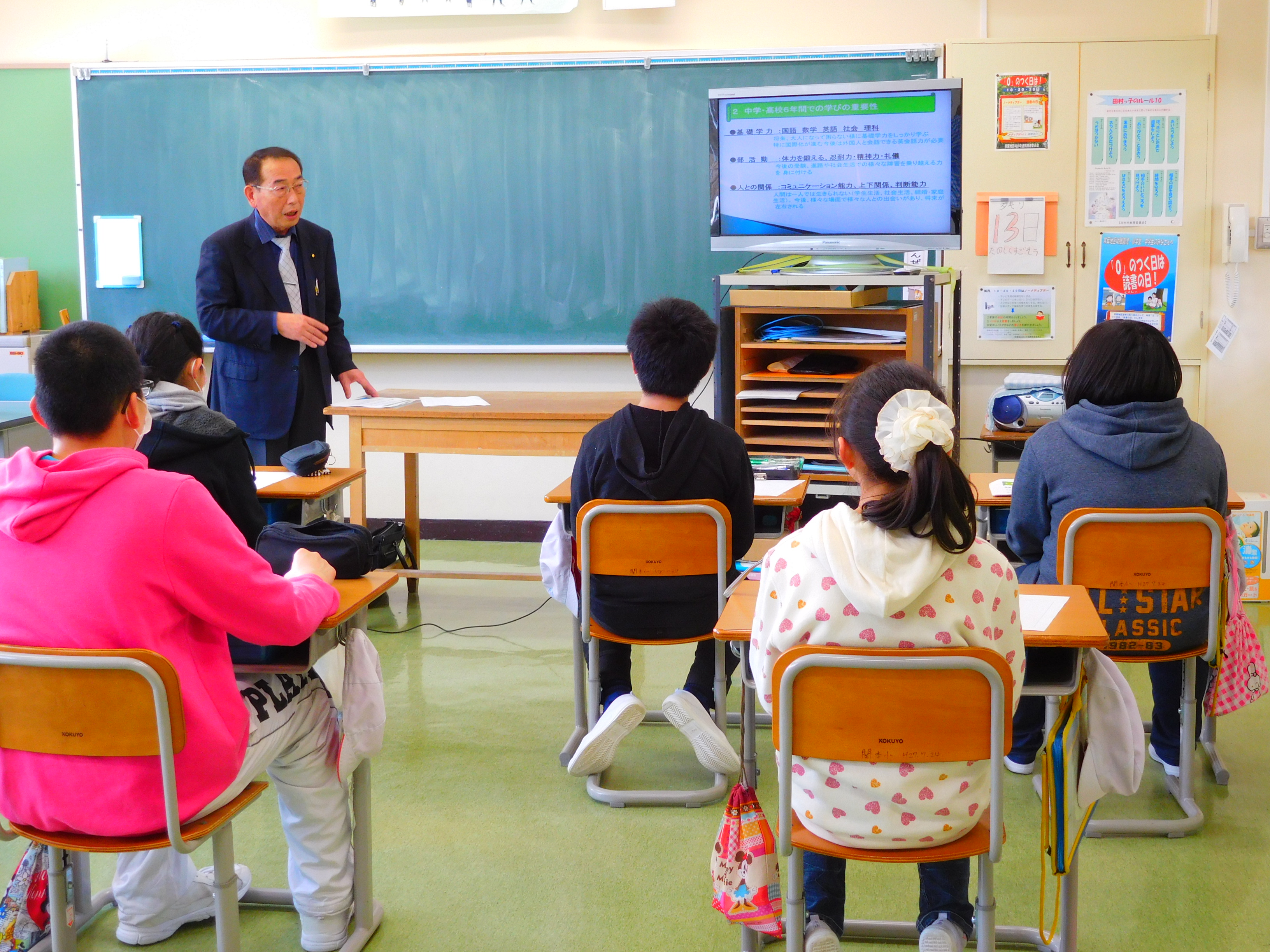 6年生のキャリア教育の一環として、2名の講師の方をお呼びして、職業講話を行いました。インターネットの急速な進化と「AI」(人工知能)の進歩に伴い、今ある仕事の半分以上がなくなってしまうと予測されています。10~20年後を見据え、確かな語学力(英語)やコミュニケーション能力(発信力)を磨いていく必要があるとのお話がありました。また、仕事においては人脈や主体的な段取り力が仕事を充実させるとのお話をいただきました。子どもたちは、夢をかたちにするためにも、ビジョンを明確にして人一倍努力することの大切さに気づいたようです。