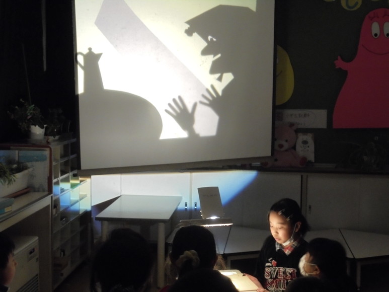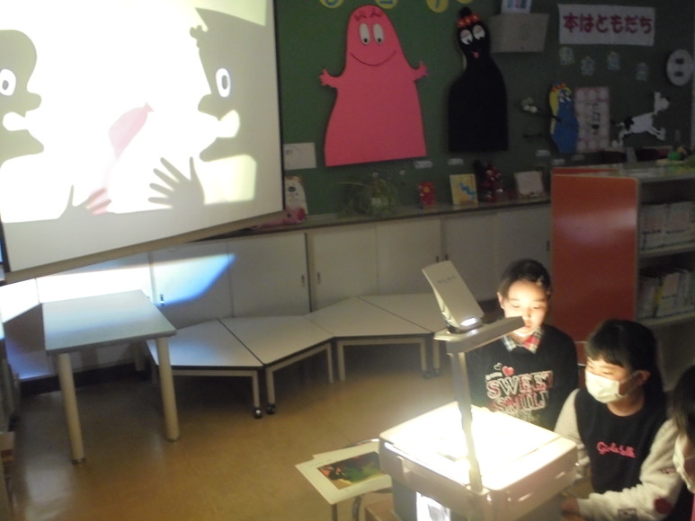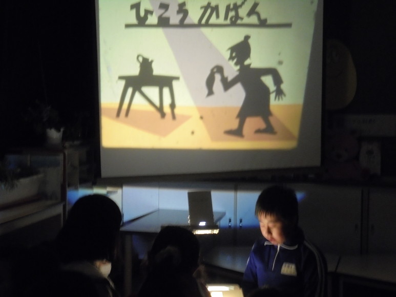 昼休みに図書委員会による影絵を使った読み聞かせが行われました。図書室を整理していた際に偶然影絵を見つけ、ぜひ全校生の前で発表したいということになりました。急きょ、OHPを借用し、本日発表の運びとなりました。暗闇の中、影絵の動きと図書委員の語りがなんとも言えない雰囲気を醸し出し、しばしの間幻想の世界を楽しむことができました。
