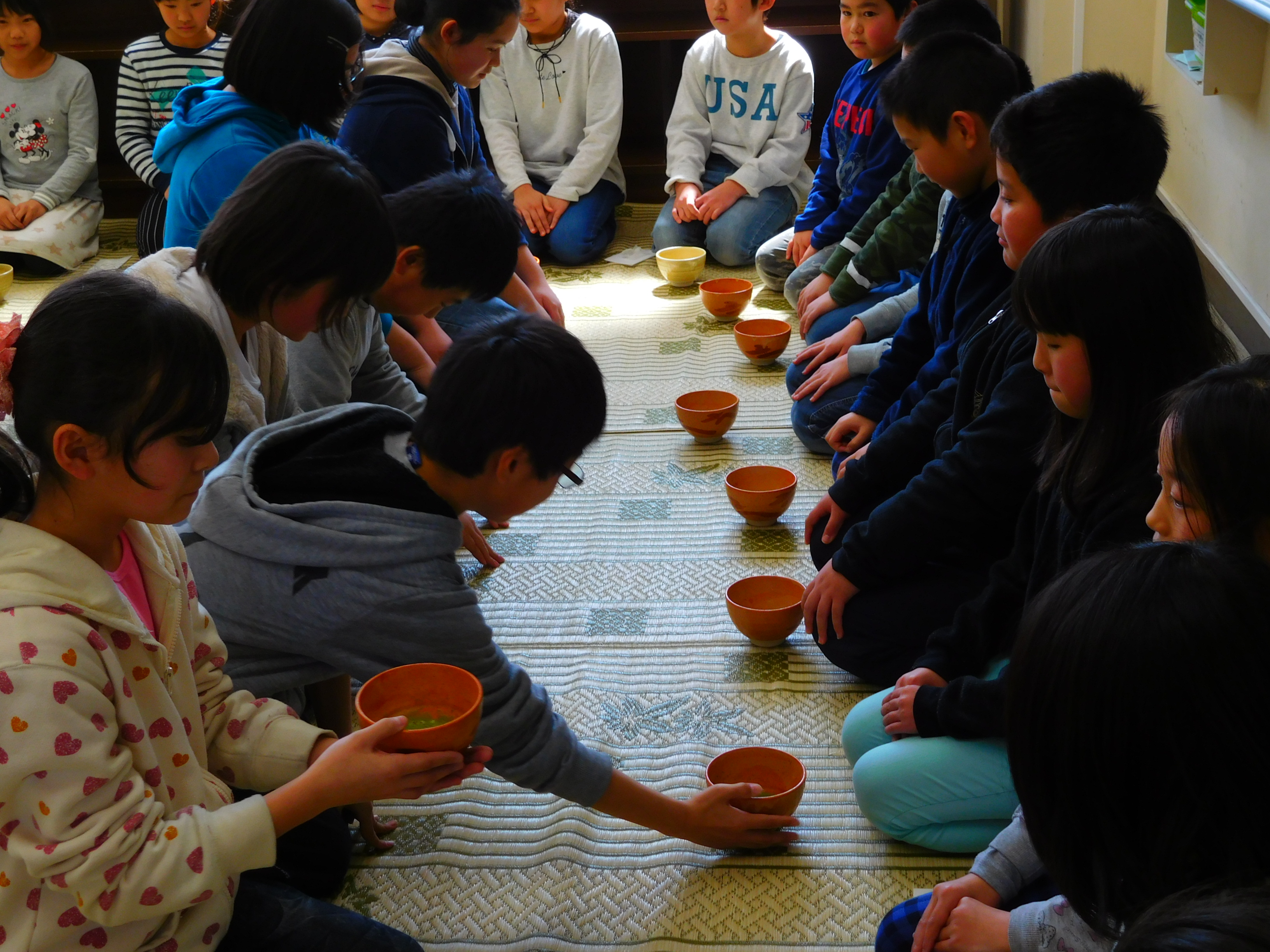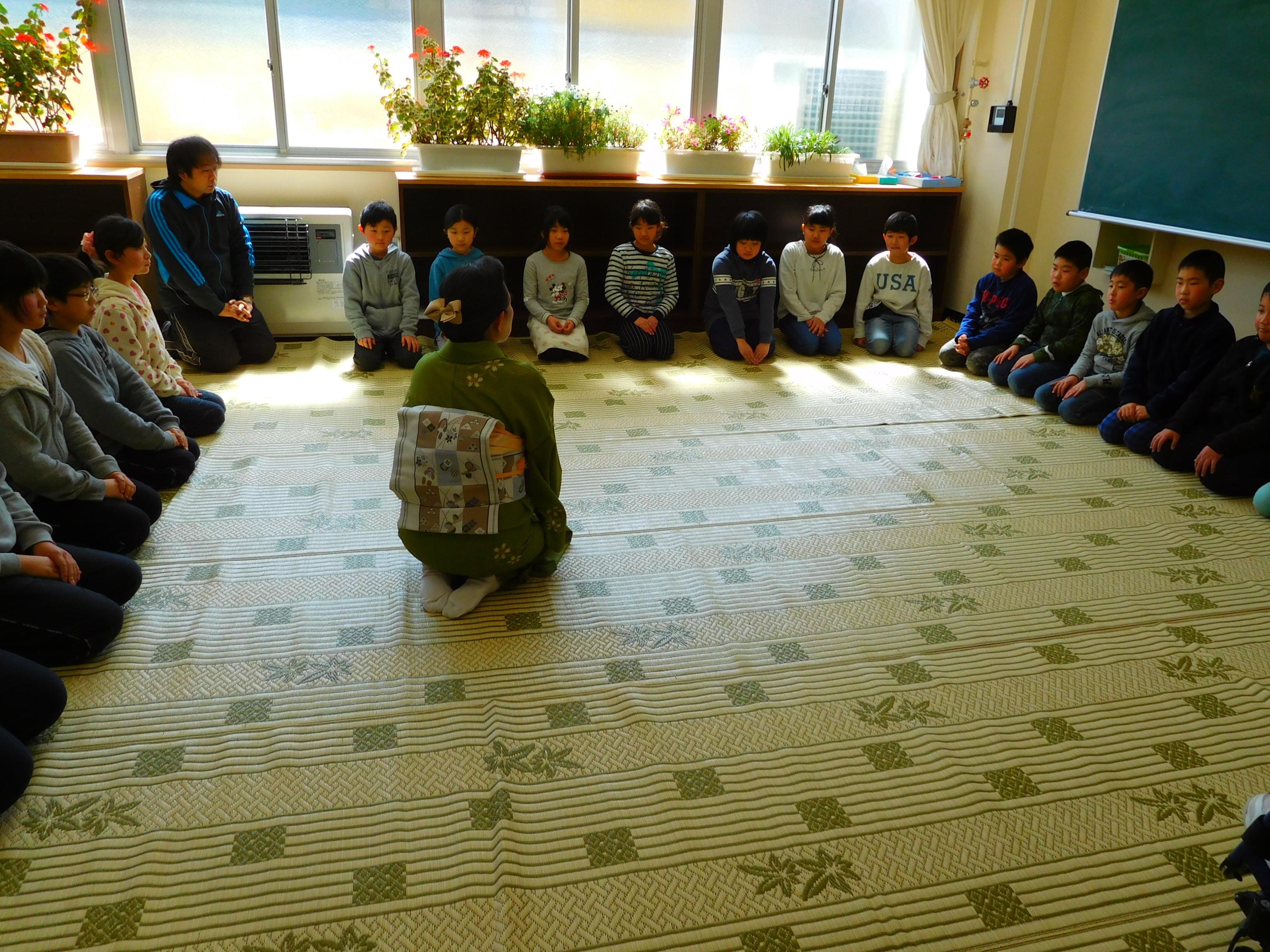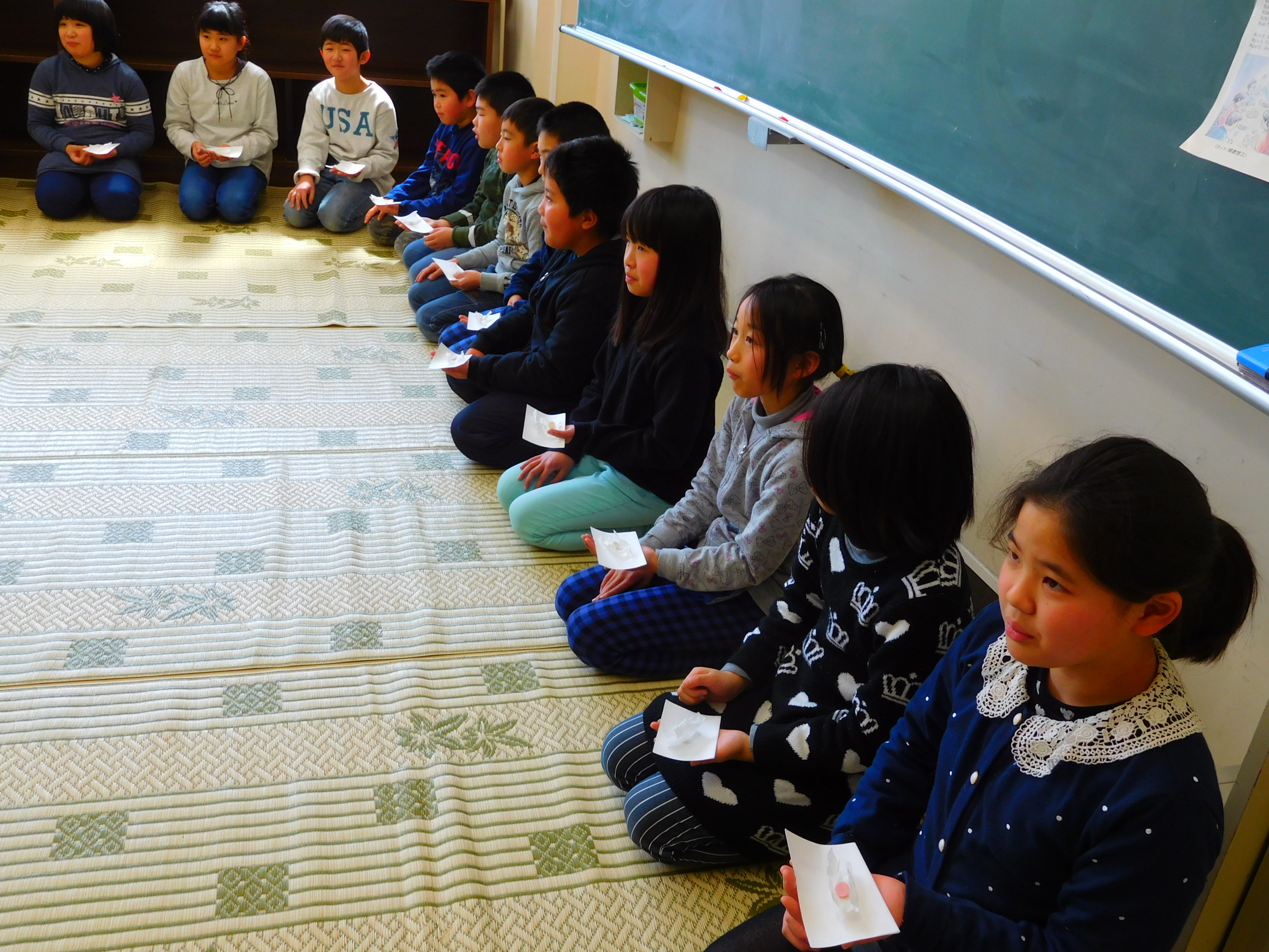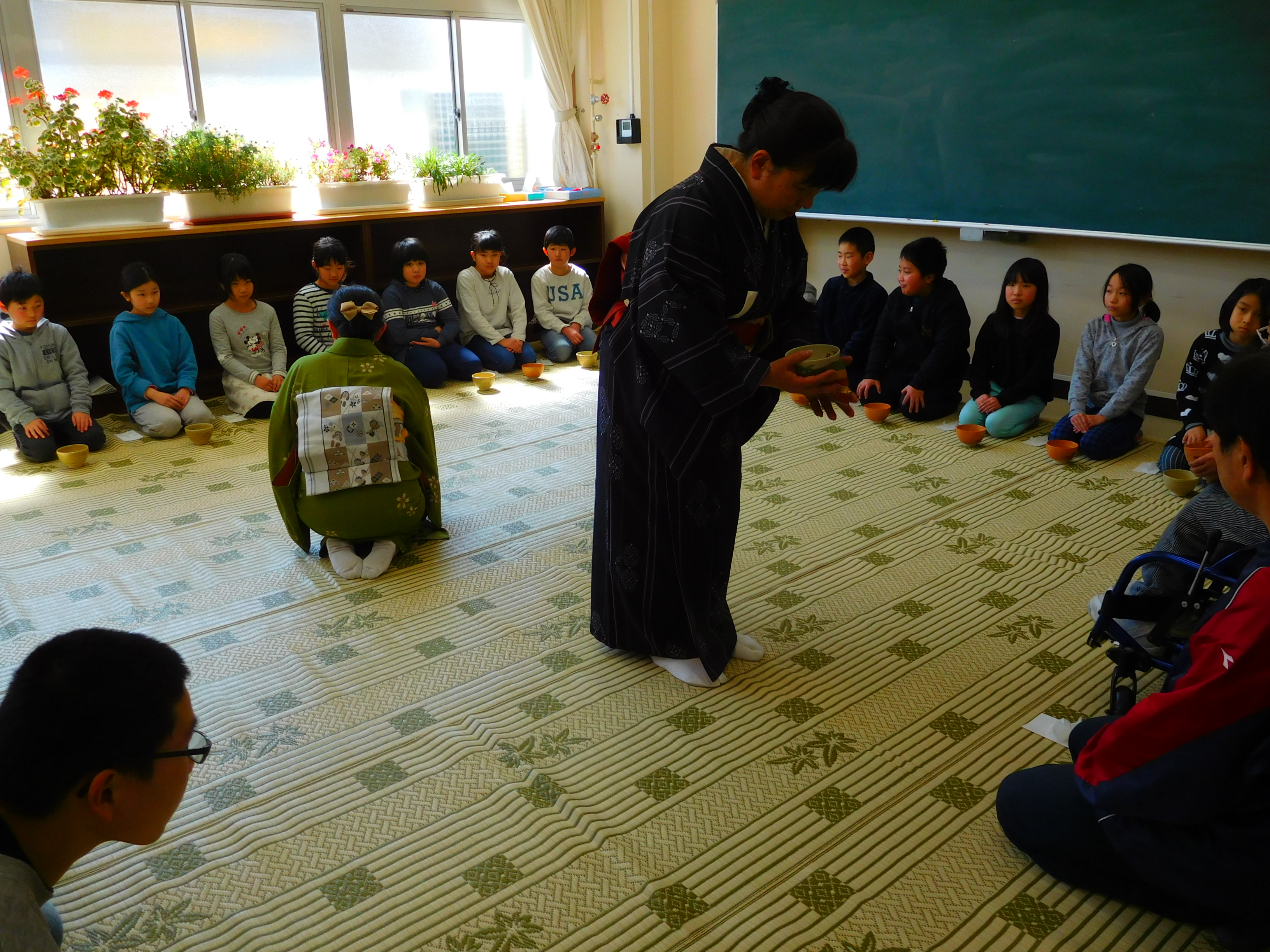 2018年3月12日 18時46分本日、茶道宗徧流芳樹会の方々を講師にお迎えして、茶道教室を開催しました。まず、講師の方から茶道の歴史や基本的な動作(礼儀や歩き方)などを教えていただきました。次に、お手前を見せていただいたり、お菓子の食べ方を教えていただきました。最後に作法に従って6年生がお茶を出してくれました。子どもたちは伝統文化がもつ厳粛な雰囲気とお茶を味わうとともに、相手を敬う奥深さ(おもてなしの心)にふれることができました。