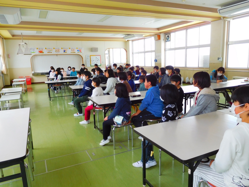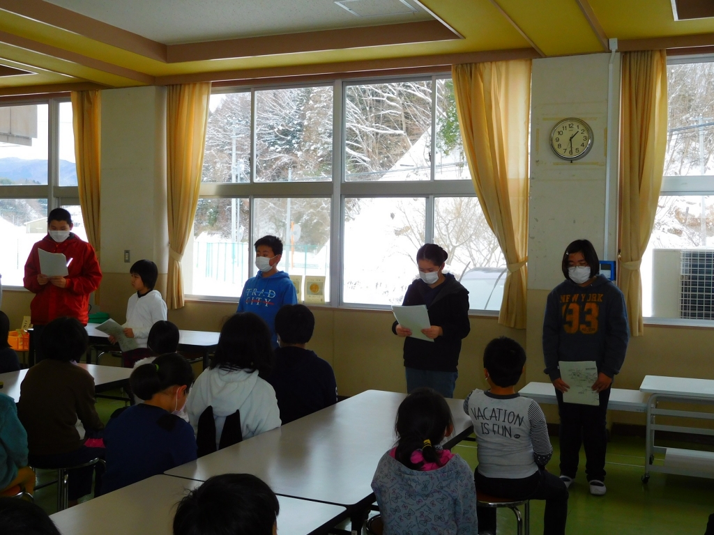 本日の昼休み終了後、食堂で通学班会議を行いました。バスの乗り方や運転手さんへのあいさつについては、よくできているとの反省がありました。保護者や地域のみなさまには、自宅からバス停までの雪かきなど、児童の登下校の安全確保につきまして、ご協力いただき誠にありがとうございます。また、しばらく寒さが続くようですので、凍結路の歩行や屋根からの落雪にも十分注意をお願いします。