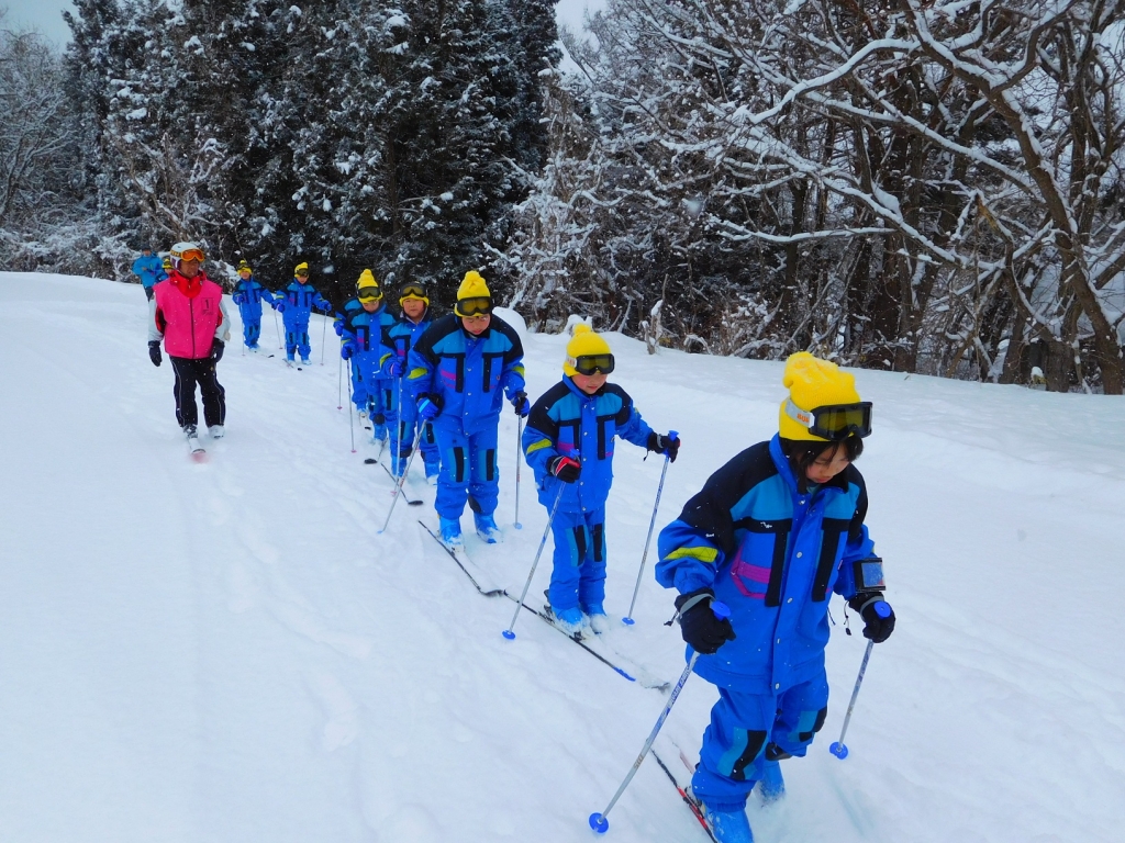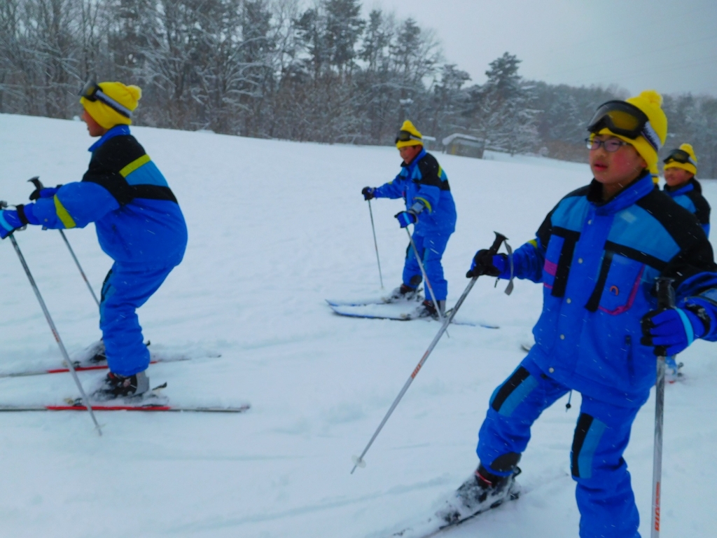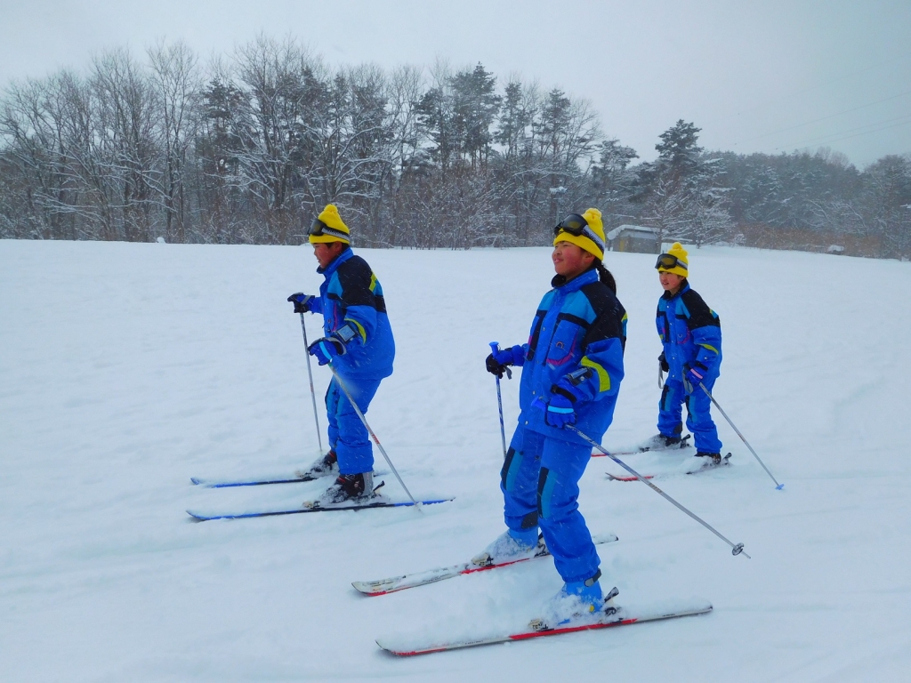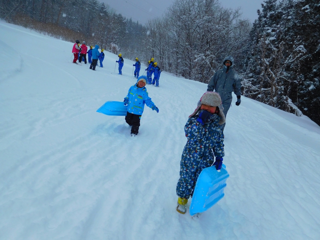 小雪がちらつくゲレンデは、風もなく新雪の最高のコンディションでした。上学年は午前中インストラクターの方々の指導のもと、滑る・止まるの基本的な練習を行いました。下学年の子どもたちは、自分でリフトに乗って雪まみれになりながら、楽しそうに滑り降りてきました。午後からは、上学年もリフトに乗って、途中何度か転びながらもスキーの楽しさを味わうことができました。静寂な白銀の世界を独占し、思う存分スキーやそり滑りを満喫することができました。