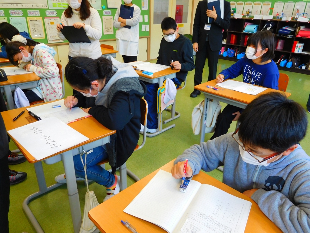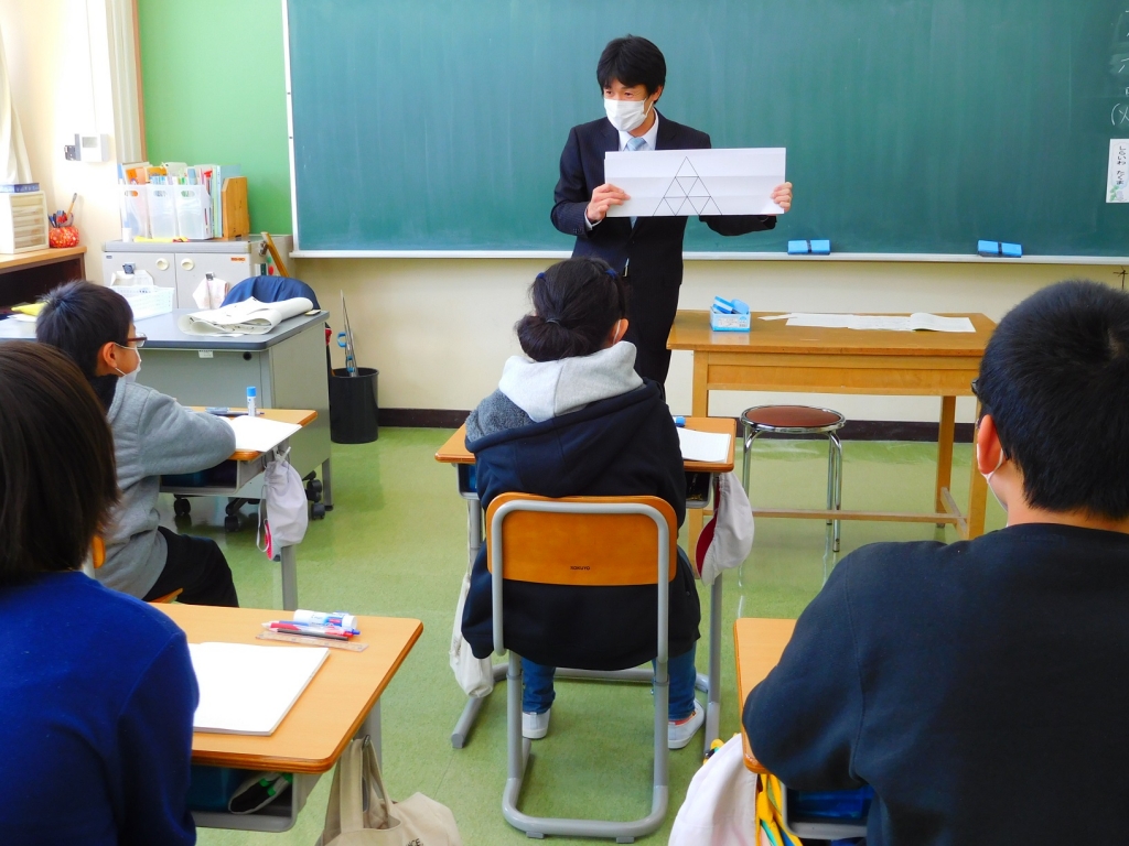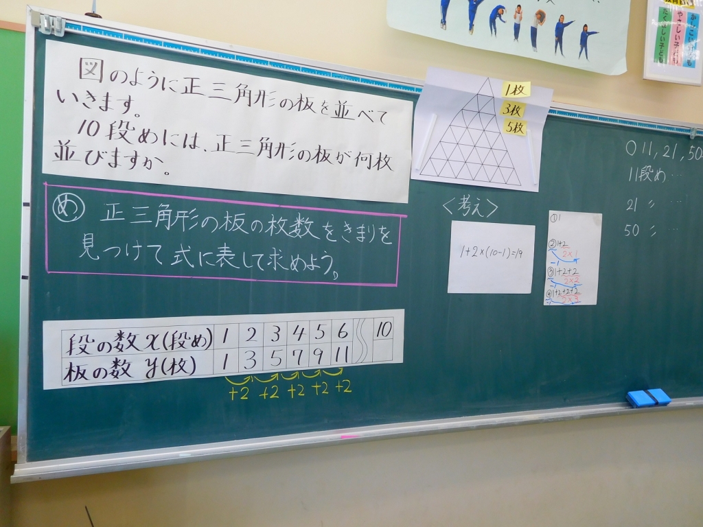 昨日、今年度最後となる授業研究会を行いました。授業は、6年生の算数で図や表を活用して、その関係性や規則性を見つけて一つの式に表す学習です。子どもたちは、階段状に積み重なった正三角形のある段の枚数をペアで話し合ったり、全体で練り上げたりしながら式に表し、答えを導くことができました。考えることの楽しさや一緒に学習することのよさを改めて実感した6年生の子どもたちでした。