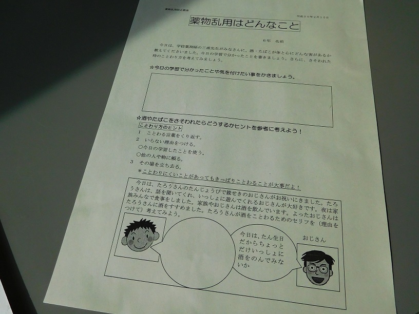 昨日、6年生を対象に薬物乱用防止教室が開催されました。酒やたばこ、薬物が脳や体にとって害になるだけでなく、精神をも蝕み、日常生活にも大きな影響を及ぼすことを薬剤師の先生に教えていただきました。子どもたちは、親しい人から酒やたばこを誘われたときにどう断るかを考えるとともに、断りにくいことがあってもきっぱりと断ることの大切さを学びました。