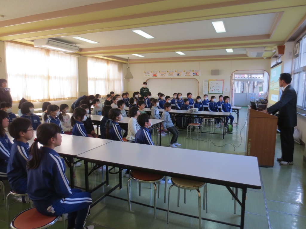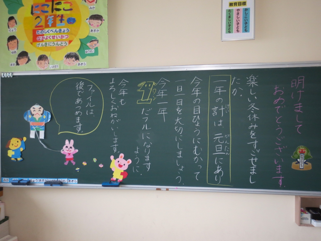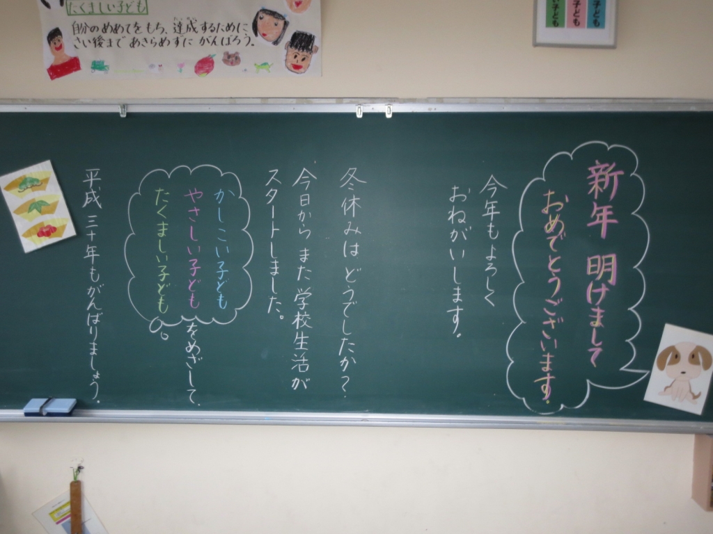 今日から平成29年度後期後半がスタートしました。17日間の冬休みを終え、元気一杯?に登校してきました。後半のスタートに当たって、各教室の黒板には新年を祝うメッセージとともに、子どもたちを励ます担任からのメッセージが書かれており、子どもたちはしっかり心に刻んでいるようでした。全校集会では、新年にあたって校長先生から、目標をもって自分の良いところを生かし、試していって欲しい。新聞やニュースを読んだり見たりして欲しいとのお話がありました。子どもたちの話を聞く態度が大変立派で、今日のスタートの気持ちが一年間続くようなそんな予感がする集会になりました。