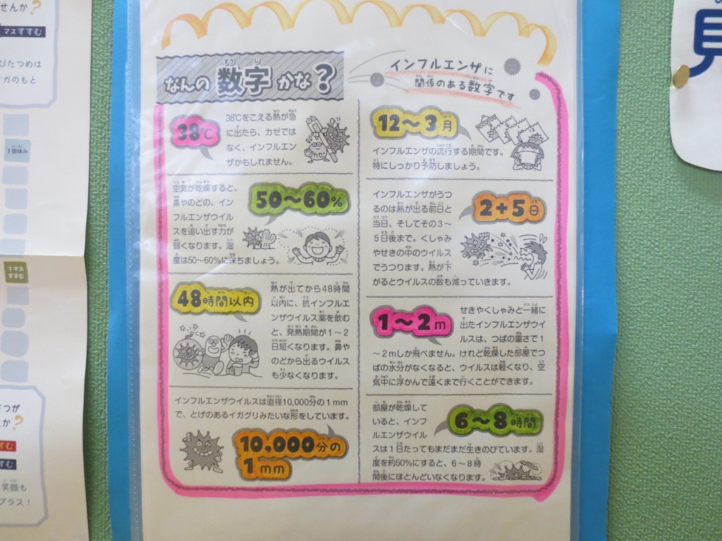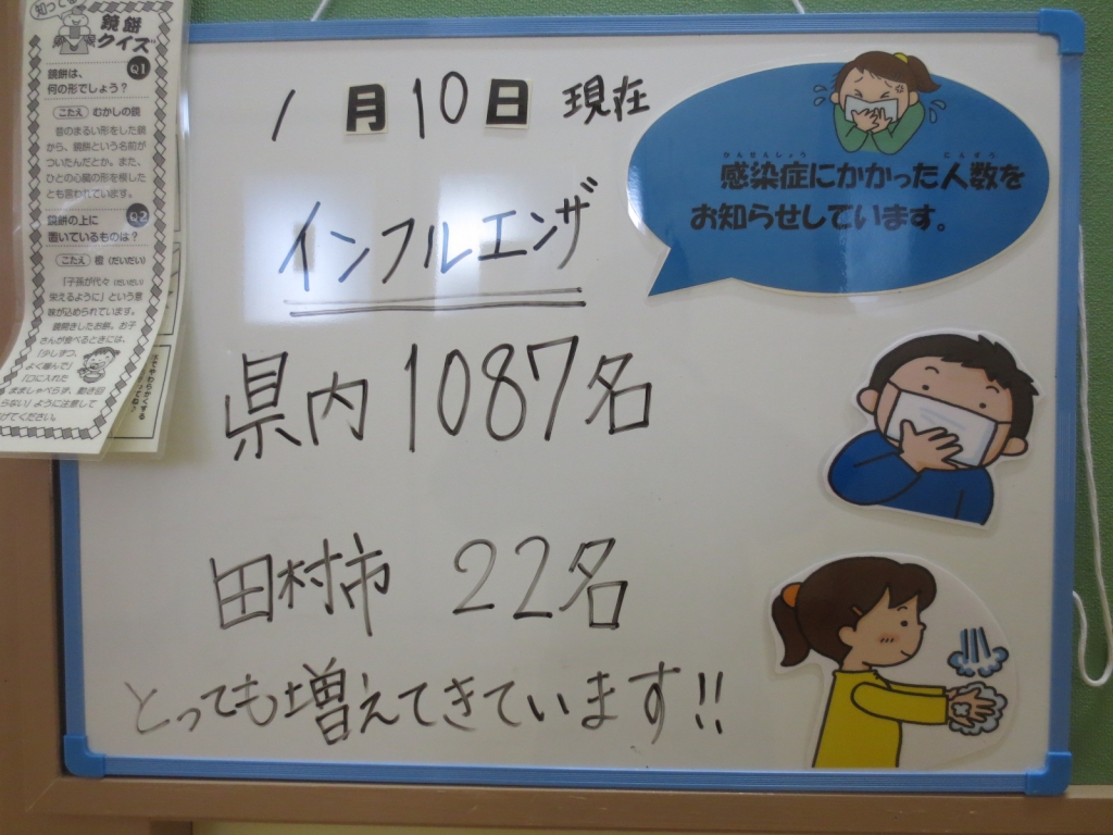 5日の新聞報道では、県内のインフルエンザの流行が注意報レベルに達したとの発表がありました。4週間以内に流行が広がる恐れがあるとして、日頃の体調管理や小まめな手洗い、マスクの着用など予防策の徹底を呼びかけています。本校でも毎日インフルエンザ情報を掲示し、子どもたちに感染拡大の注意を呼びかけています。土曜日・日曜日の外出の際には、マスクを着用したり、帰宅後に手洗いをしたりするなど、予防にご協力を よろしくお願いいたします。