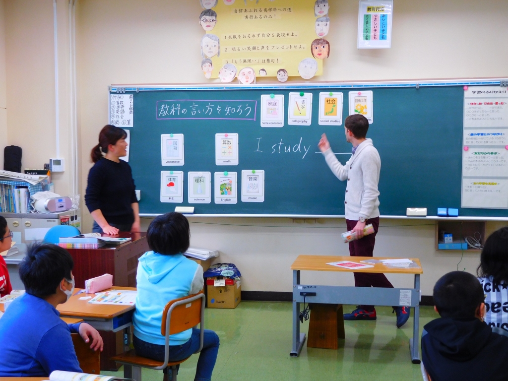 5年生は、英語の曜日や教科の言い方に慣れることを目的に、ALTの先生と楽しく学習しました。始めに、全体であいさつの仕方を練習した後、英語版の「はらぺこあおむし」の読み聞かせを担任が行い、絵本にある曜日の表現を確認しました。次に、ALTの発音をよく聴いて、繰り返し教科の発音を練習しました。なかなか発音が難しい教科もありましたが、子どもたちは、変化のある繰り返しの学習で、少しずつ発音に慣れ親しむことができました。
