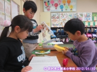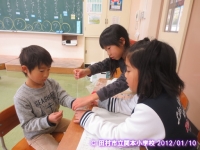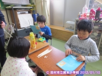 生活科の学習で,2年生はおもちゃ大会を開きました。1年生が招待され,おもちゃの作り方や遊び方を教えてもらいました。一生懸命説明する2年生。話をよく聞いて楽しそうに遊ぶ1年生。それぞれが充実した時間を過ごすことができました。