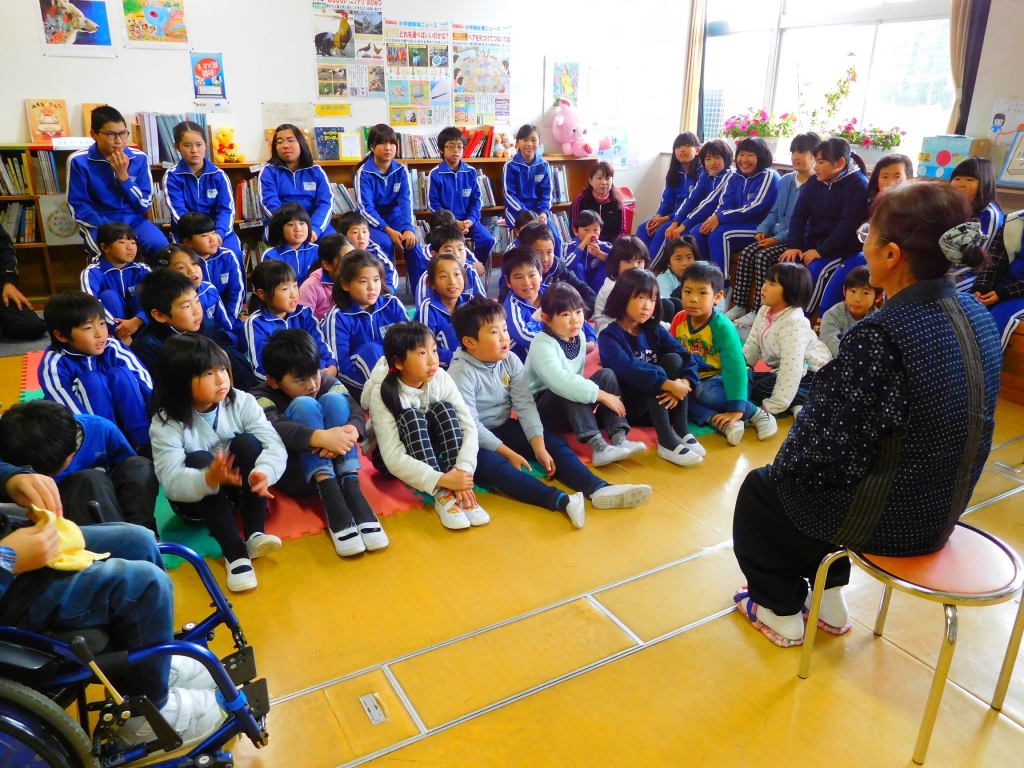 本日、民話語りの方においでいただき、昔から日本に伝わる民話を聞きました。子どもたちは、どの民話にも真剣に聞き入るほど、巧みな話術で心に響くものでした。語り部の方には、子どもたちの聞く態度やうなずきなどの反応がよいことを褒めていただきました。