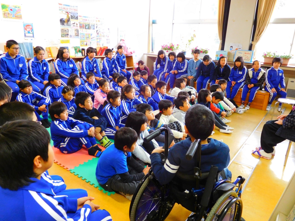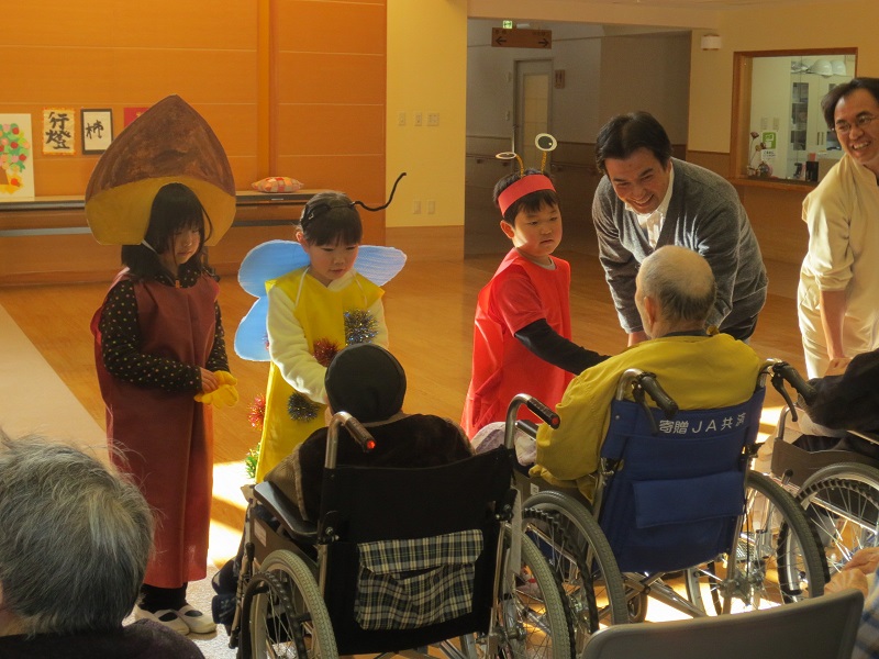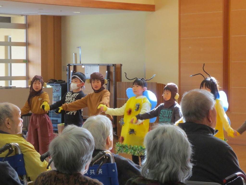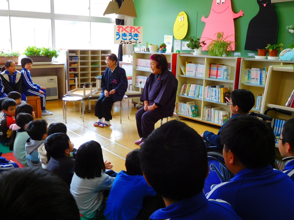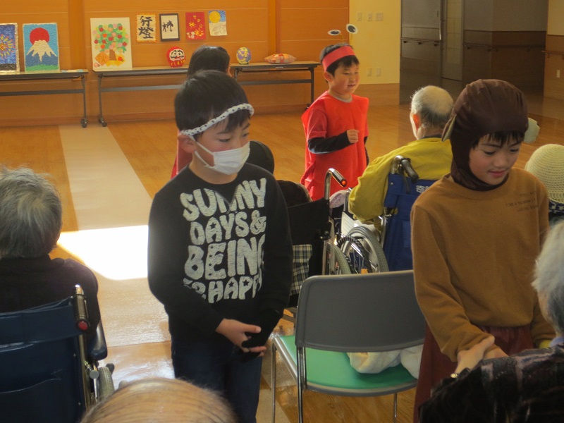 1・2年生がときわ荘を訪問し、学習発表会で発表した「さるとかに」を演じ、入居されている方々との交流を図ってきました。子どもたちは、緊張した様子でしたが、最後に握手してたくさん褒められました。おじいちゃん、おばちゃんに喜んでもらい、大満足の子どもたちでした。