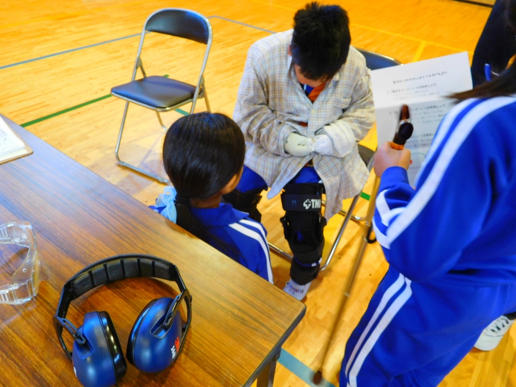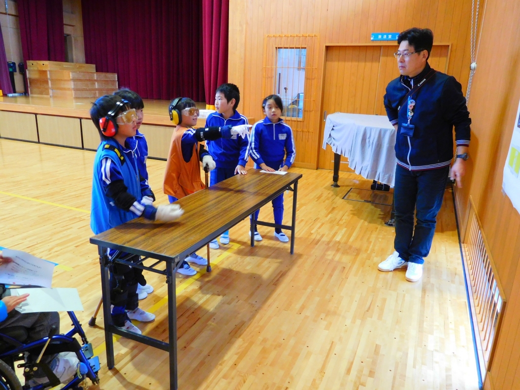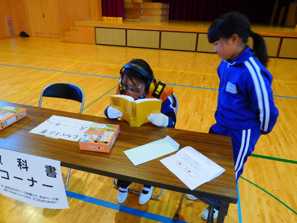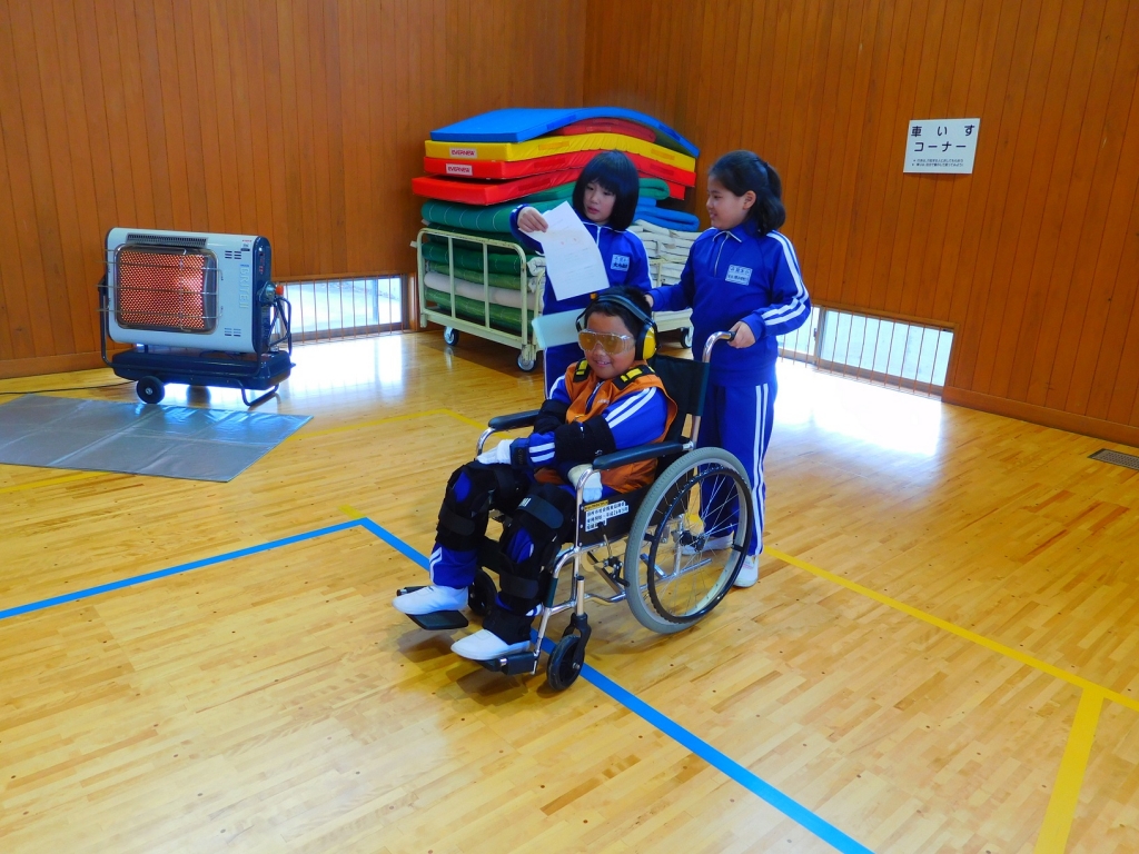 3・4年生が高齢者擬似体験活動を行いました。老化はマイナスのイメージをもちがちですが、擬似体験活動をとおして、加齢による身体(筋力、視力、聴力)の変化や低下を知り、高齢者の気持ちを理解するとともに、コミュニケーションの取り方を学び、思いやりの心を育むことがねらいです。子どもたちは、擬似体験用具を身に付け、車いす体験や視覚体験、手袋をしながら着替えや辞書の指定のページを開く体験等を行い、日常の違いと感覚の変化にとまどいながら、介護される立場を踏まえて、高齢者とのかかわり方を学びました。