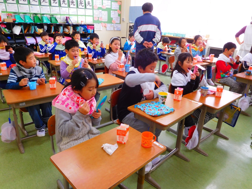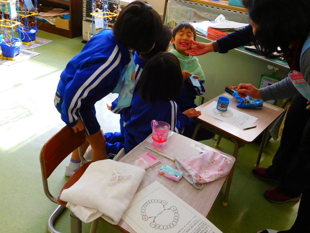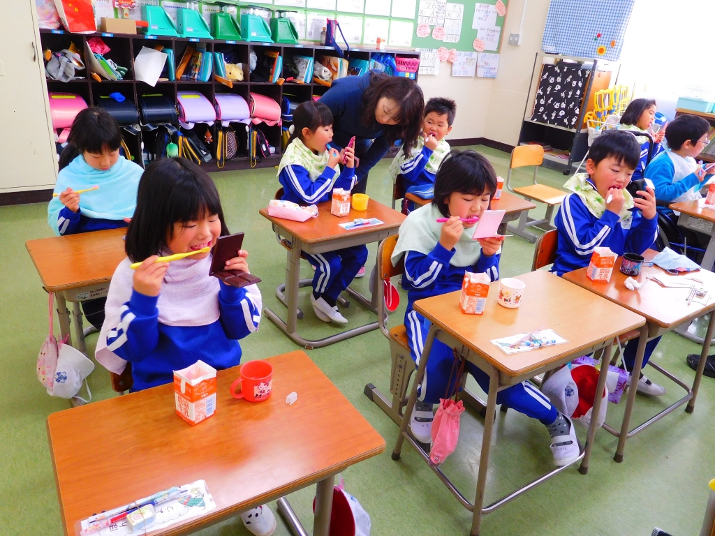 本日、1年生と2・3年生が「よい歯の教室」を実施しました。望ましい生活習慣の確立とむし歯予防の意識を高めるため、歯科衛生士さんの指導をいただきながら、歯の染め出しを行い、歯の汚れとむし歯の関係やブラッシングのポイントを学習しました。子どもたちは赤くなった歯を鏡で観察しながら、汚れやすい部分をしっかり確認していました。ぜひ、食べたら磨くを実践し、むし歯の予防に努めて欲しいと思います。