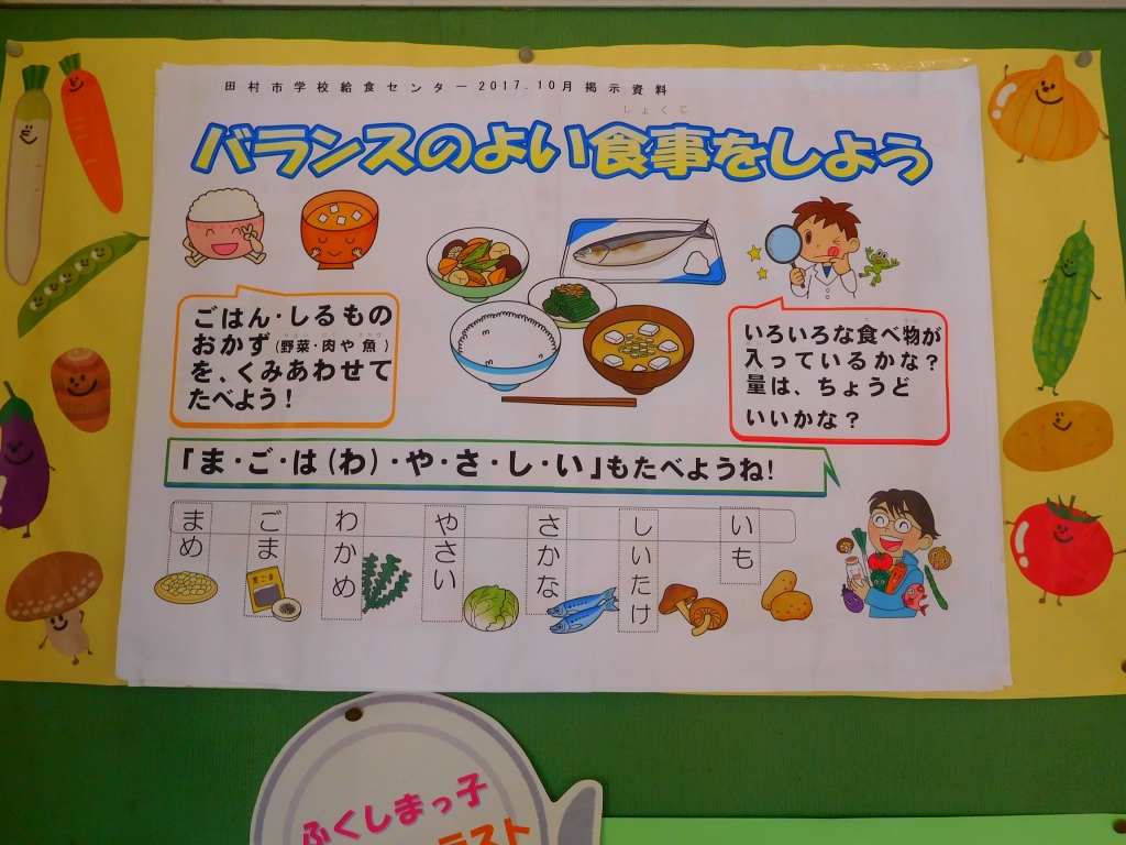 ふくしまっ子の食の課題として、不規則な食習慣や偏った食事に伴う肥満傾向や体力低下が挙げられています。本校では、先日給食試食会を実施し、食に関する指導の実際を見ていただきました。さらに、食に関する知識や食を選択する力を養うために、本校の食育コーディネーターが中心となって、工夫してより分かりやすく、食に関する情報提供を行っています。今後も家庭における食育の応援をいただきながら、子どもたちが自ら望ましい食生活を実践していく力を育んでいきたいと考えています。