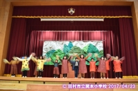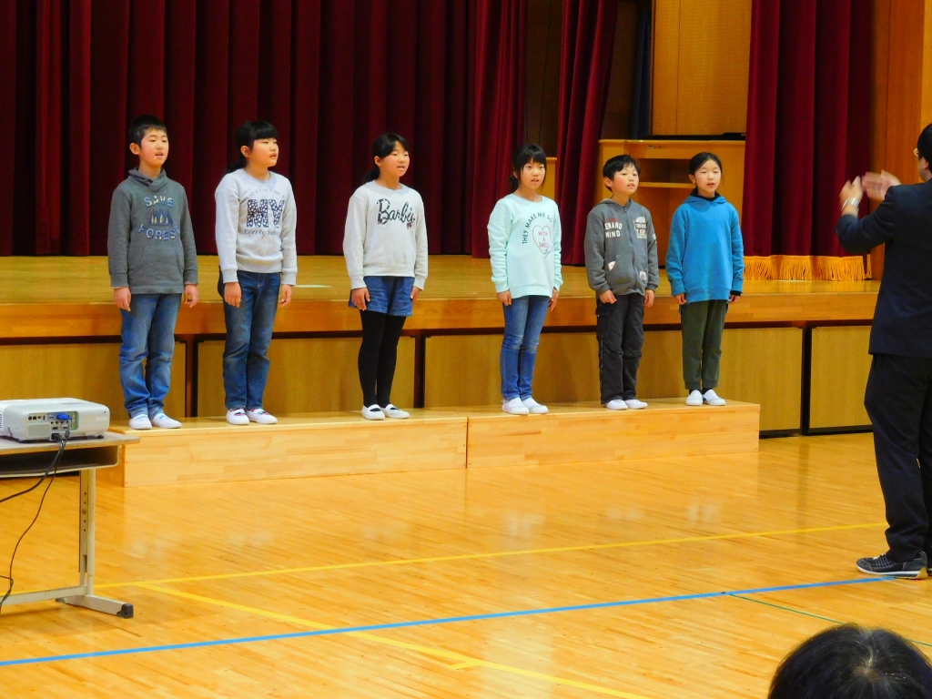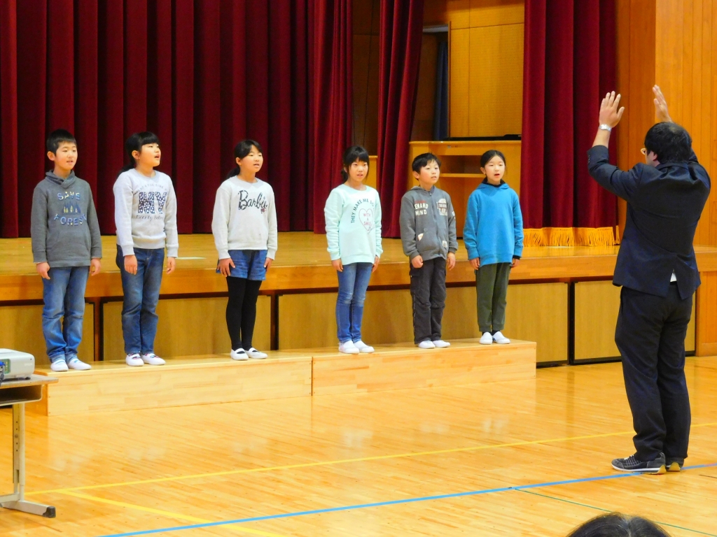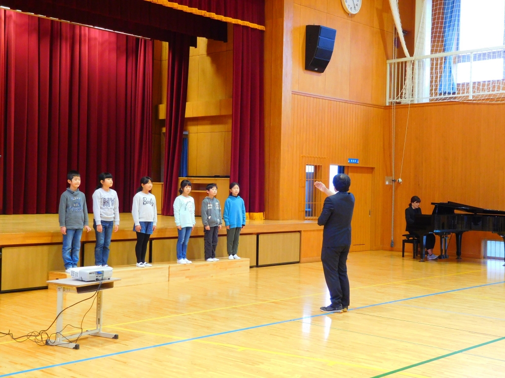 本日、第9回田村市小学校童謡歌唱音楽祭に向けた校内発表を行いました。本番では、関本小学校、西向小学校、常葉小学校合同で夏の歌「夏の思い出」と「まきばの朝」を合唱します。今日は、その練習も兼ねて全校生の前で発表しました。1名欠席でしたが、伴奏に合わせて、少ない人数ながらも伸びやかな歌声を響かせていました。
