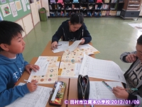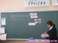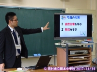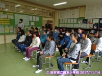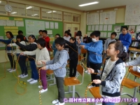 5・6年生は理科学習の一環として,福島県県中建設事務所の方を講師に,防災教育を行いました。どんな災害が身の回りでおこっているか,それらの災害から身を守るためにどうしたらよいかについて,写真やDVDで詳しく教えていただきました。また,身を守るための綱の結び方についても教えていただき,実際に結ぶ練習を行いました。「家庭でも,『田村市防災マップ』などを見て,家族みんなで危険箇所を確認しておくとよいです。」と,アドバイスいただきました。