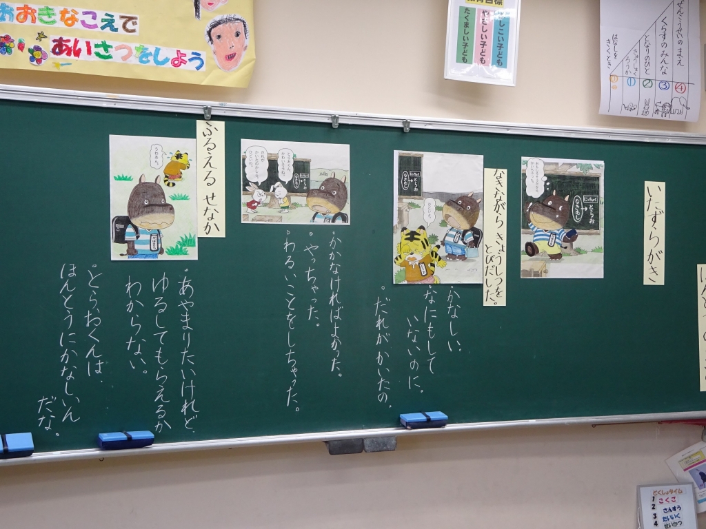 5校時目に、第10回の校内授業研究会を実施しました。主題は、「正直で素直な心」とし、「いたずらがき」の資料をもとに、1年生が道徳の授業を行いました。ちょっとした悪意のないいたずらが、時としてひどく相手を傷つけ、取り返しのつかない事態を引き起こすことを理解し、過ちをごまかさずに本当のことを伝え、素直に謝ることの大切さを学ぶものです。4人の子どもたちは、登場人物の立場になって、自分だったらどうするか(価値葛藤)を真剣に考え、進んで発表する姿が見られました。
